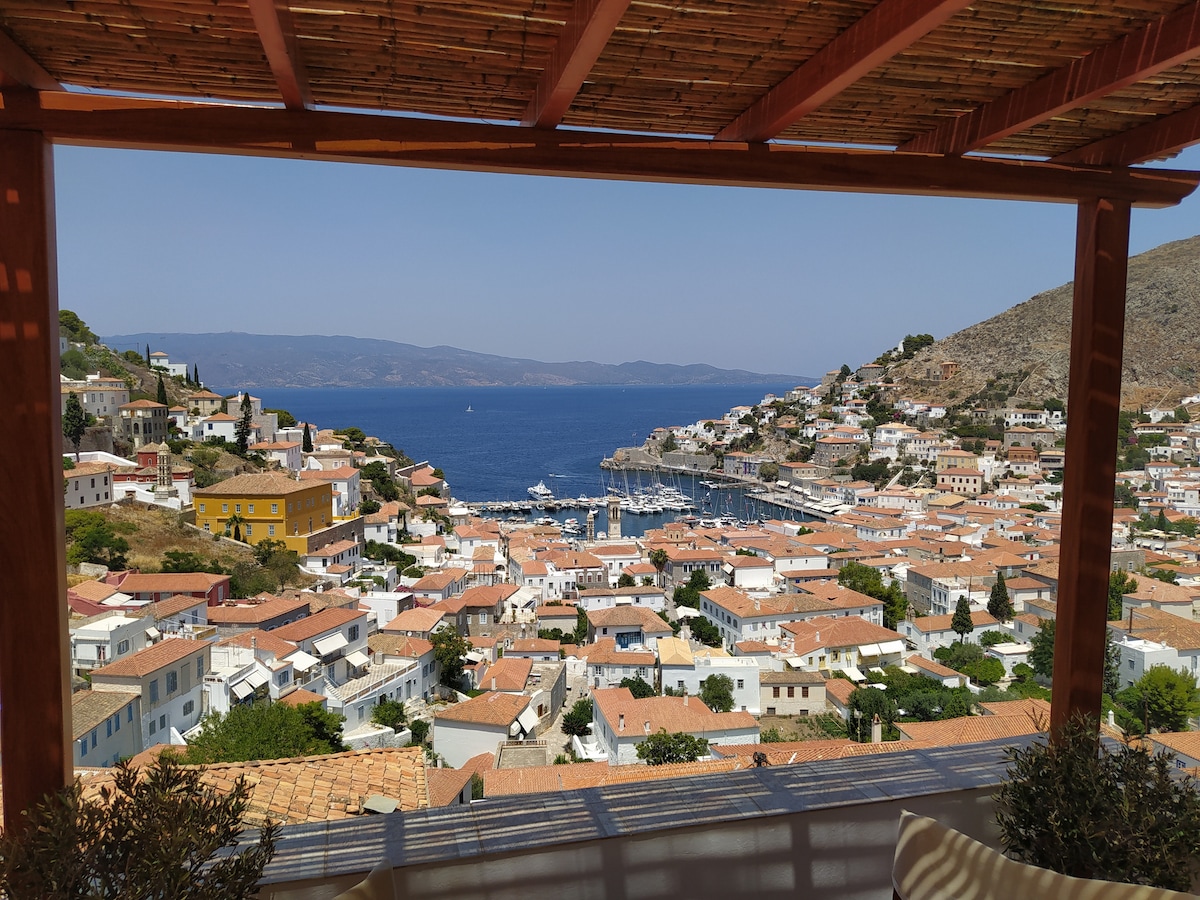 Hydra's view house is an accomondation in the centre of the island providing a panoramic view of Hydra and its port which you can enjoy from the house's rooftop as well as its bedrooms. The house has got a fully equipped kitchen for the preparation of your daily breakfast, lunch or dinner. The living room and the bedrooms provide their own TV, air-condition and WiFi. Also, the house is only 10-12 minutes away from the port to the centre of the island dy foot following a road with stairs.