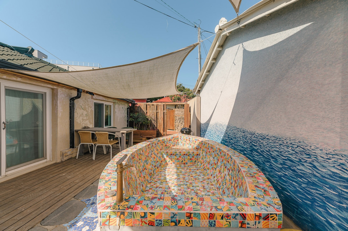 贝壳型按摩浴缸/沙滩/私人赞助/温馨花园/距离合宰海滩步行3分钟/济州古玉