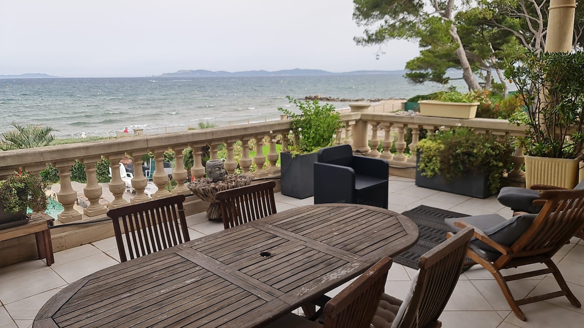 Appartement refait à neuf sur la magnifique et longue plage de la Bergerie Face à la mer, pieds dans l'eau directement sur la plage, Sabine et Sébastien vous accueillent dans leur magnifique cocon contemporain. Véritable havre de paix pour amoureux de la mer, vous ne la quitterez pas des yeux et pourrez profitez du lever de soleil sur les îles d'Or de votre lit. Ambiance cosy et chaleureuse, l'appartement et sa terrasse de 27 m2 sont à l’extrémité de la résidence pour plus d’intimité.