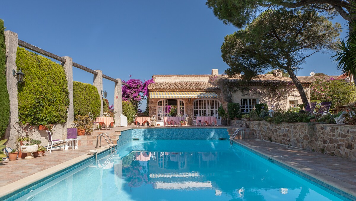 Hotel de charme, vielles pierres 1857 , calme et spacieux, chambre de caractère, lit king size , prestation ménage. Grand jardin fleuris, collection de cactées, grande piscine à 50 m de la mer. wifi gratuit. Petit déjeuner gourmand maison servis autour de la piscine, sur la terrasse vue mer, ou sous la pinède. Garage fermé payant, gratuit dans l'impasse, chien admis avec supplément. ping pong , boules.