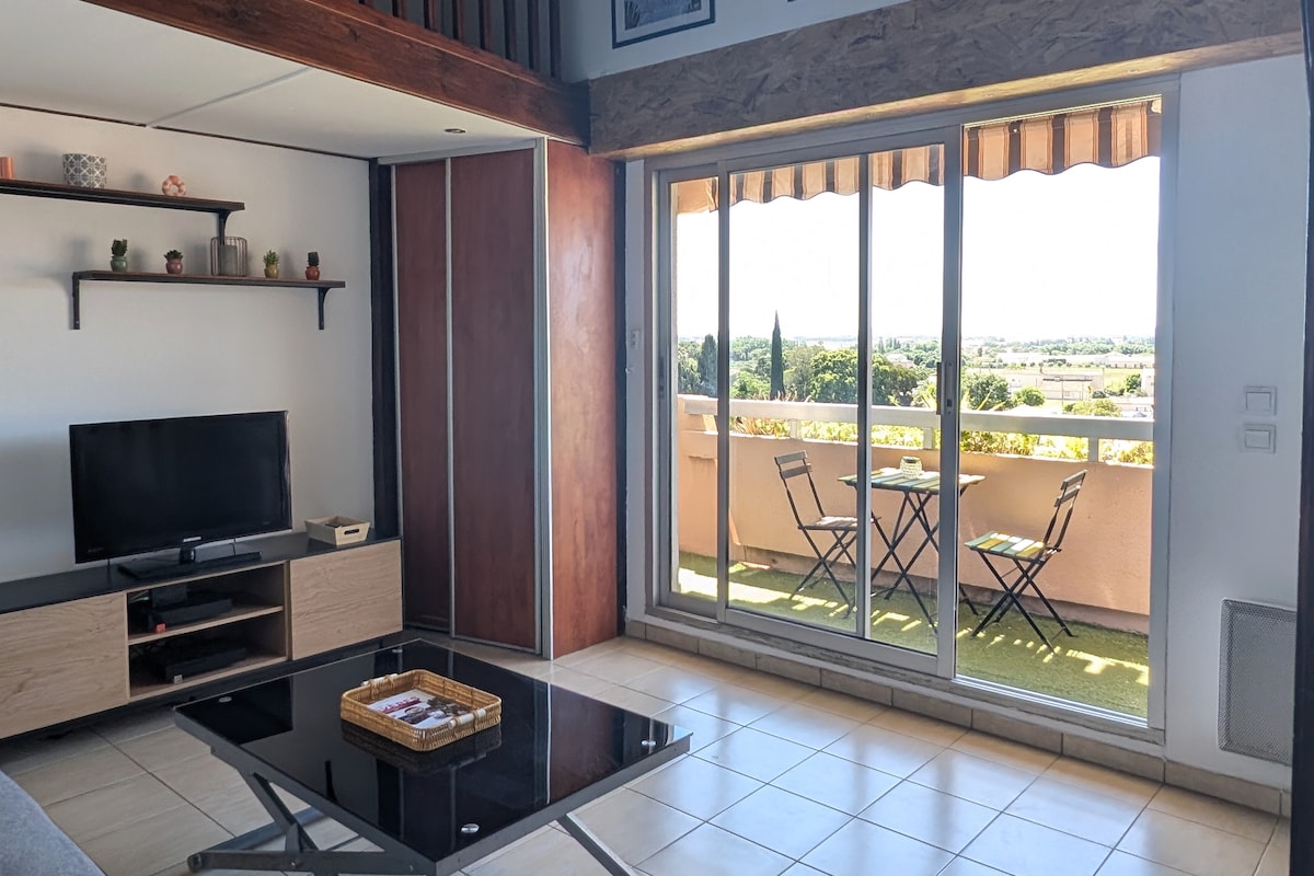 Lodge exotique et romantique avec grande terrasse sud et jacuzzi chauffé, une vue imprenable, sans vis à vis. Lit Queen matelas mémoire de forme. Linge, shampooing douche, peignoirs à votre disposition. Salle de bain, douche italienne. TV connectée. Lodge au 1er étage d'une résidence, entrée indépendante et parking sécurisé dans la propriété. Quartier résidentiel, à flan de colline. Profitez du jacuzzi à 37 degrés même en hiver sous les étoiles et la lune ! 🤎⭐️🌝 Départ tardif sur demande.