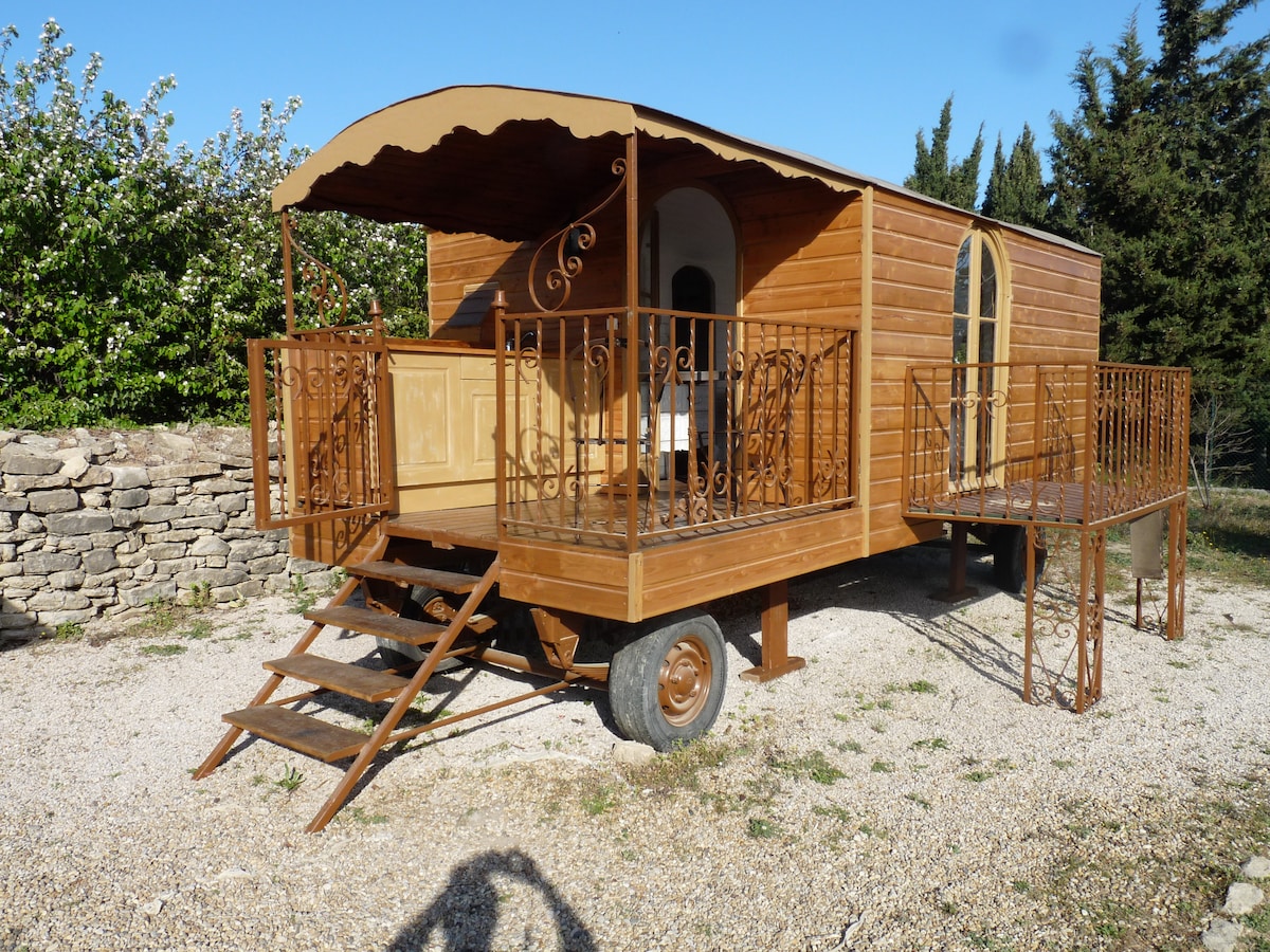 roulotte foraine renovée pour 2 personnes avec tout le confort : lit double ou 2 lits simples, baignoire, toilettes, kitchenette equipée, climatisation reversible, terrasse privative avec transats et barbecue. nos hotes ont acces à la piscine chauffée d'avril à octobre, au terrain de boules, au ping pong, au jacuzzi (conditions d'acces restreintes), à la cuisine d'ete