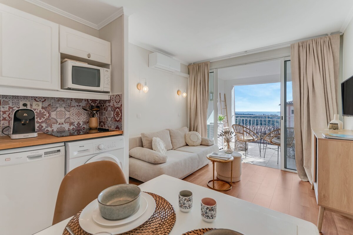 Bright and spacious apartment of 90m² on the 1st floor of a family house, with open sea view and private southern terrace. Located in a quiet environment, just 2.4 km from the beaches and in the immediate vicinity of the trails, it is ideal for savoring a breakfast in the sun or an outdoor evening. Completely independent entrance, secure private parking and full reversible air conditioning for optimal comfort.
