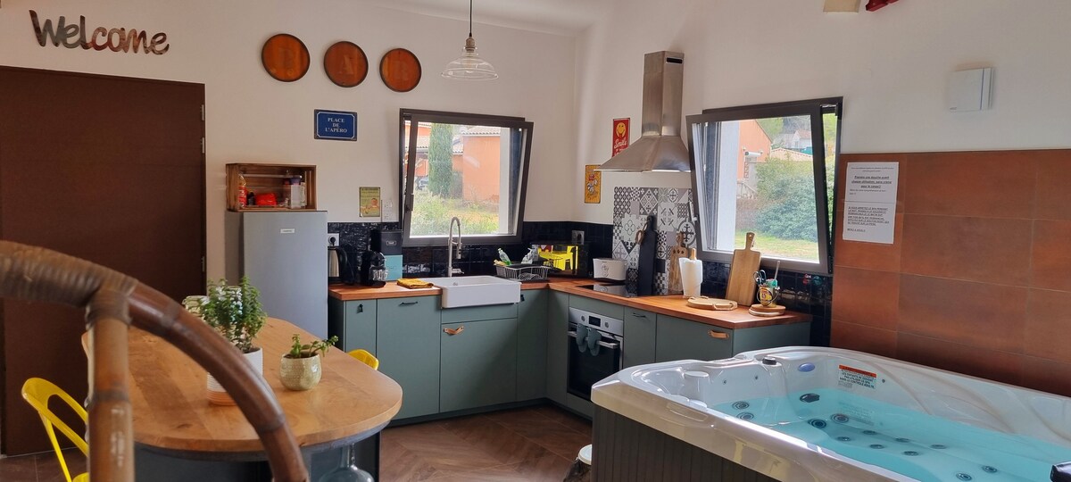 A 10minutes de Cassis et de ses calanques, dans un petit village, maison de 50m2 neuve type loft, avec poutres apparentes et terrain de boules juste fini (et boules à disposition)! Jacuzzi intérieur 3places, cuisine toute équipée, douche à l'italienne et terrasse de 35m2 au milieu des pins. Wifi. Autoroute à 5min. Mais aussi, proche, de Marseille, la Ciotat, Bandol. Parfait pour un weekend en amoureux, détente assurée.