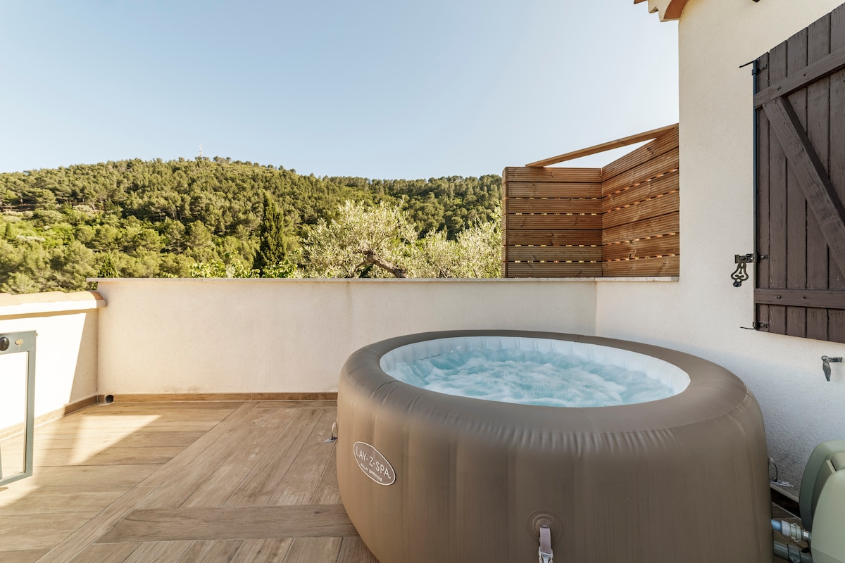 Venez vous détendre dans cet appartement de 25 m² climatisé attenant à notre villa situé à 800 mètres du centre ville, 1,2km des plages, à proximité de la forêt et à 3 km de Sanary et de son marché nocturne l'été. Quartier calme, parking privatif . Cuisine équipée, plaque vitro, micro onde, four réfrigérateur cafetière, bouilloire, grille pain Belle terrasse avec barbecue gaz chaises longues Draps et serviettes fournis Un bip portail vous sera remis à votre arrivée