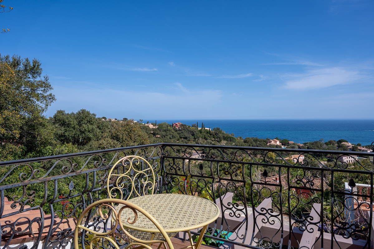 Pour des vacances exceptionnelles dans un appartement rénové; l'environnement unique au sommet d'un domaine privé, sans voisinage direct et avec une vue mer fantastique. Chambre double, salon, coin repas, cuisine et des terrasses, une face au jardin, une face à la mer. Accès à la piscine (Chauffage sur demande, pris en charge des frais), les serviettes et le linge de lit sont fournis. Buanderie, machine à laver et sèche-linge. Plage La Nartelle 8 min. en voiture, center ville 10 min. en voiture
