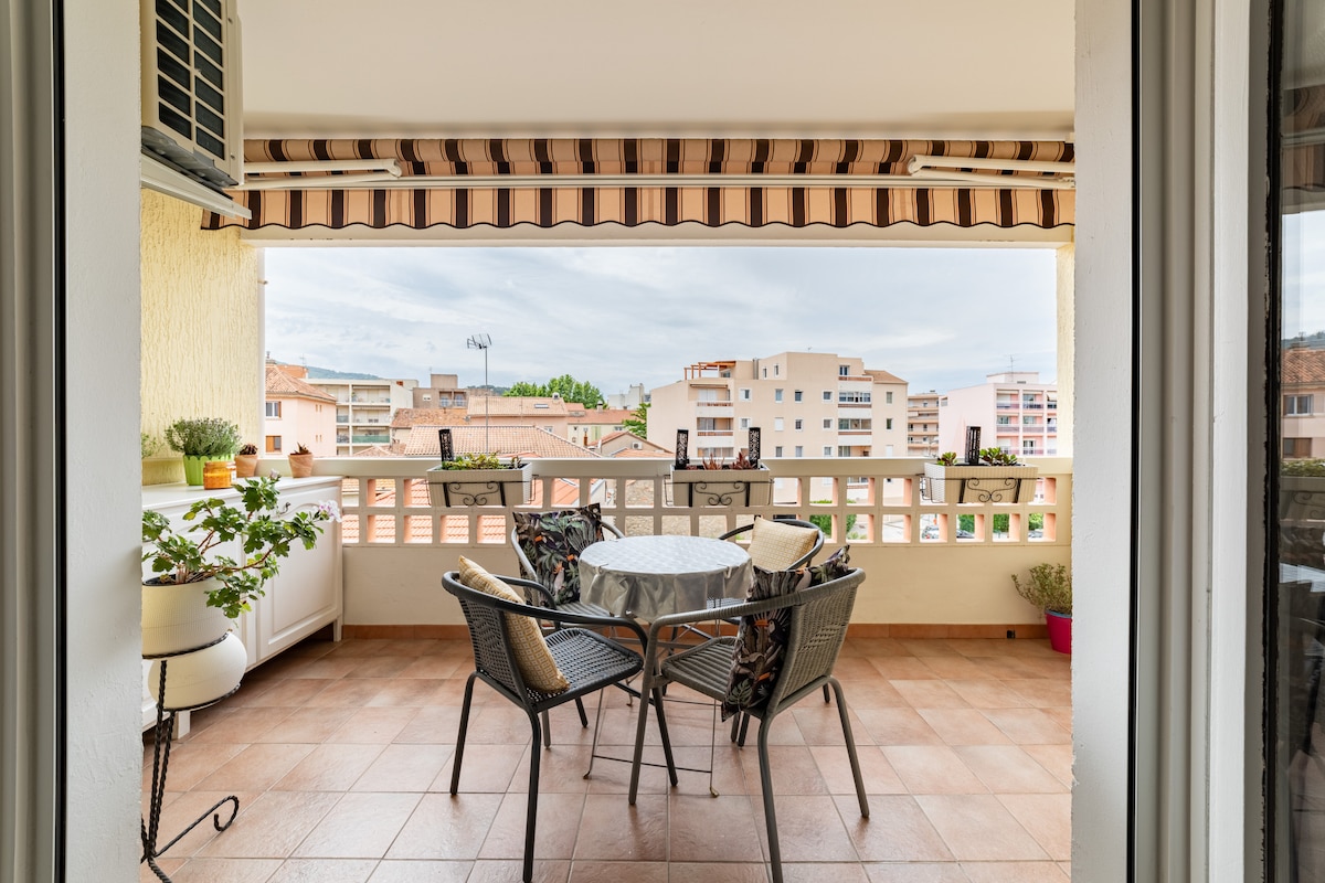 Joli appartement F2 de 35m² climatisé en plein centre ville de Hyères. Calme et rénové, internet via fibre et place de parking dans un garage fermé inclus. 11 marches à monter. Boulangerie, supermarchés, restaurants, bus et centre historique aisément accessible à pieds. Plages à 5km. Cute flat, 35 square meter in the city center. Very quiet, it has been renovated in June 2020. Fast internet. A parking space is included. 11 steps to climb. All comodities reachable on foot. Beaches at 5km