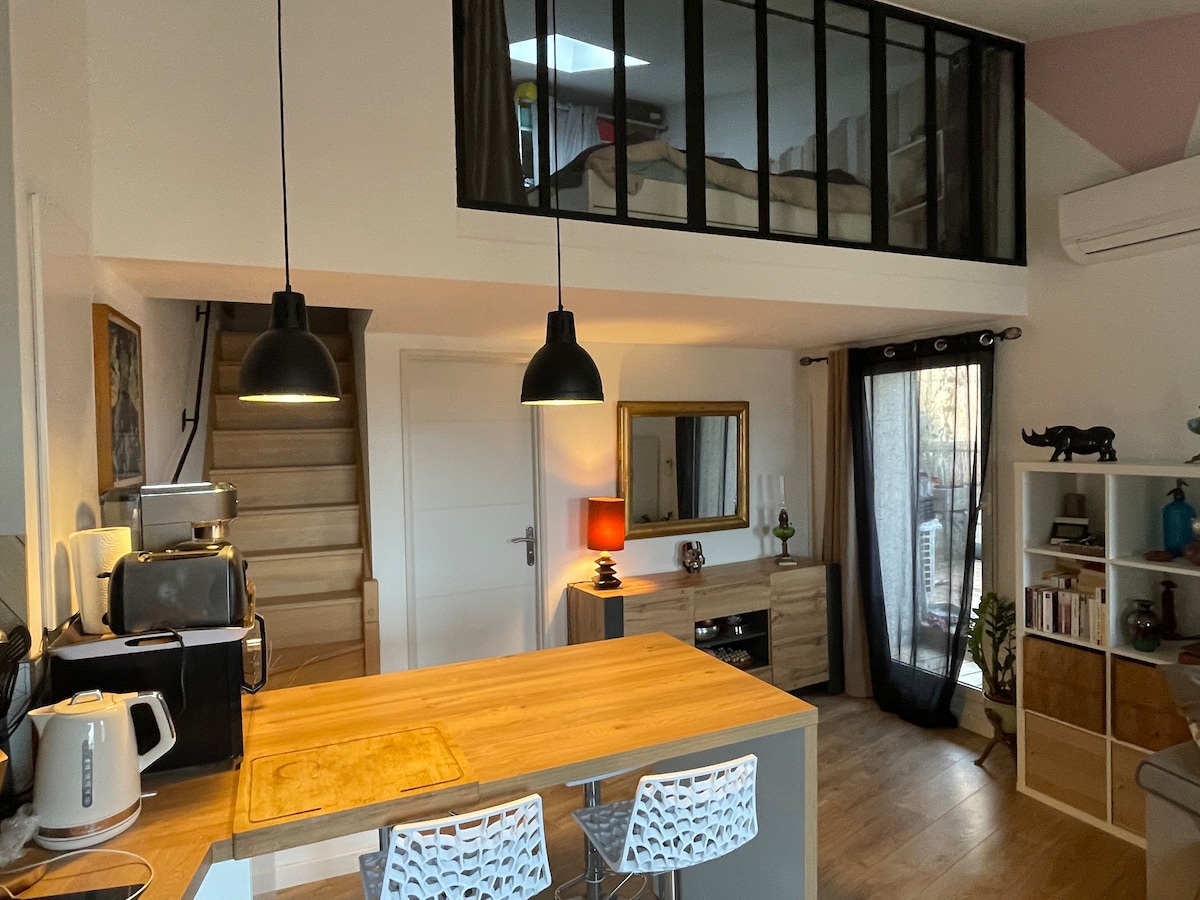 Plongez dans une ambiance unique méditerranéenne proche du centre ville à pied et à 7minutes de la plage. La beauté pure de la chaux et du béton ciré se mêle à la matière brute, sublimée par les imperfections et savoir-faire traditionnel. Un cadre authentique, chaleureux et apaisant, idéal pour vous ressourcer au cœur de la nature. Face à un jardin remarquable classé. Profitez d’un décor méditerranéen épuré, alliant confort moderne,charme artisanal, pour une expérience inoubliable.Ideal couple