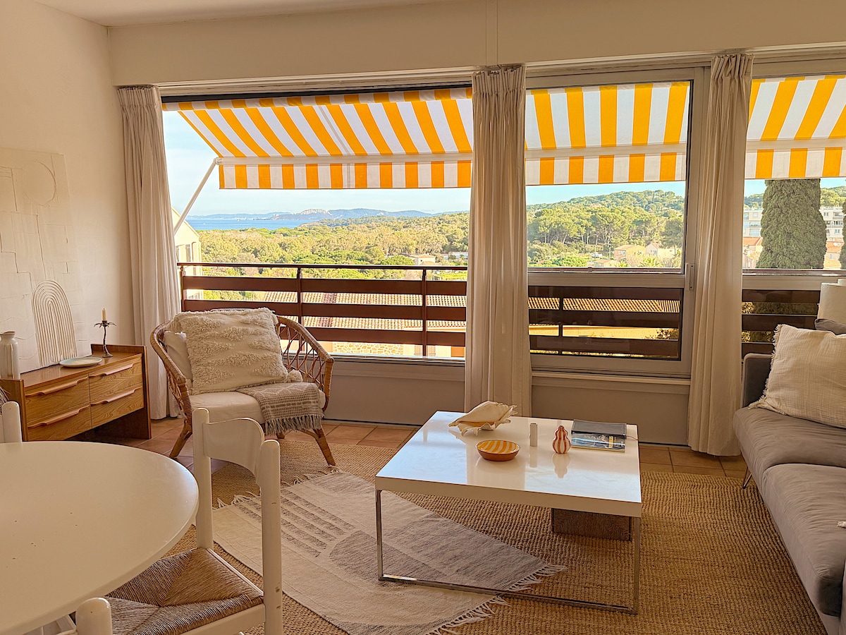 Appartement refait à neuf sur la magnifique et longue plage de la Bergerie Face à la mer, pieds dans l'eau directement sur la plage, Sabine et Sébastien vous accueillent dans leur magnifique cocon contemporain. Véritable havre de paix pour amoureux de la mer, vous ne la quitterez pas des yeux et pourrez profitez du lever de soleil sur les îles d'Or de votre lit. Ambiance cosy et chaleureuse, l'appartement et sa terrasse de 27 m2 sont à l’extrémité de la résidence pour plus d’intimité.
