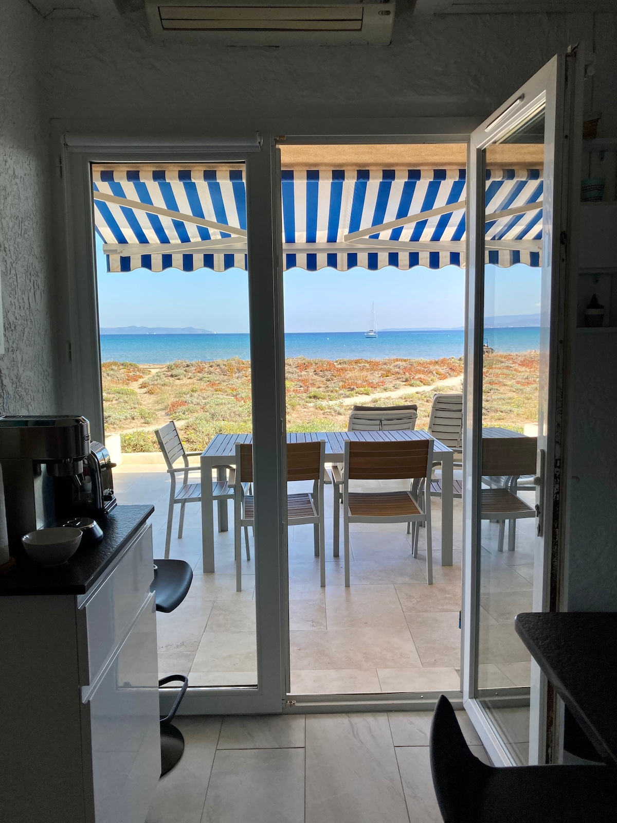 Appartement refait à neuf sur la magnifique et longue plage de la Bergerie Face à la mer, pieds dans l'eau directement sur la plage, Sabine et Sébastien vous accueillent dans leur magnifique cocon contemporain. Véritable havre de paix pour amoureux de la mer, vous ne la quitterez pas des yeux et pourrez profitez du lever de soleil sur les îles d'Or de votre lit. Ambiance cosy et chaleureuse, l'appartement et sa terrasse de 27 m2 sont à l’extrémité de la résidence pour plus d’intimité.
