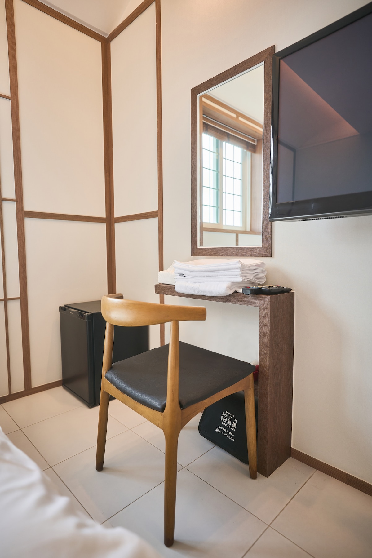 Queen Bed: 1 Occupancy: 2 (Max: 2) The moment you open the door, the high ceilings and rectangular layout evoke the exotic liberation of staying at a European boutique hotel. As the gentle sunlight filters over the ivory walls, the refined relaxation unique to 'Flat Tom' truly begins. Amidst the thoughtfully curated designer furniture, you’ll find a leather sofa and table—the perfect spot to lean back, lose yourself in a book, or indulge in quiet contemplation.