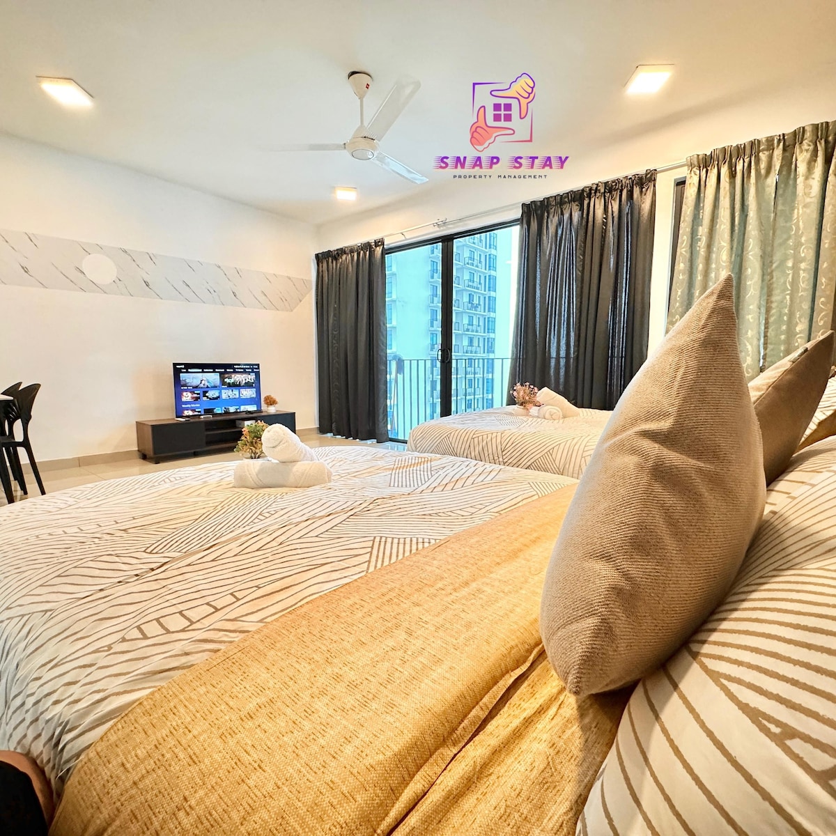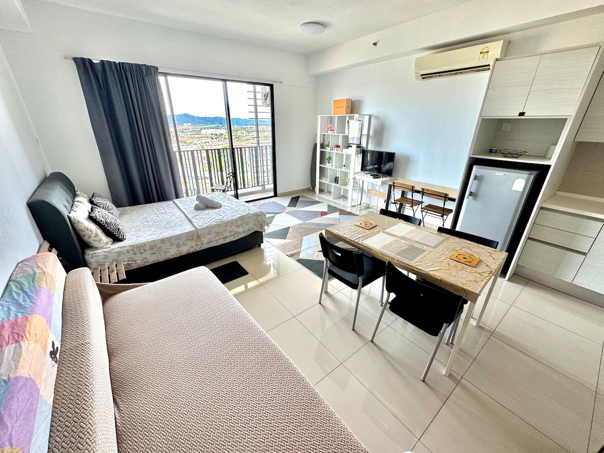 Nice Studio with two Queen Size Bed, Clean and tidy Fully Furnished. Unit Included - Microwave - Electric Stove - Cattle - Dinning Utensils - Netflix - Internet - Towel - Fridge Affordable Price for Family and Couple. Walking Distance to Setia City Mall and Setia City Convention Centre. Easy Access to Food stall and Family Mart, 7-11 at ground Floor. L