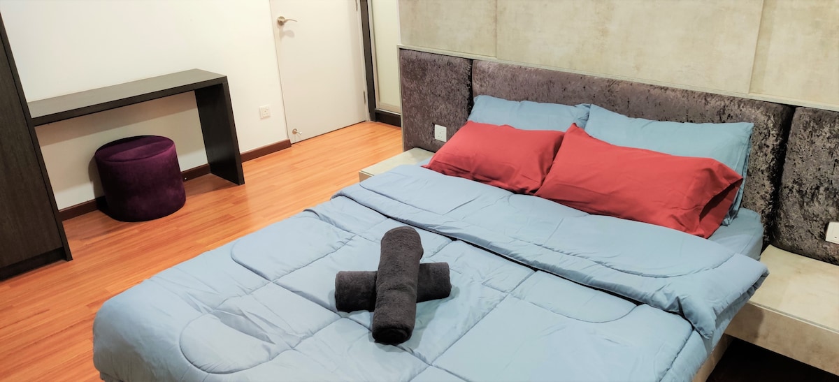 The whole group will be comfortable in this spacious and unique space. Other then hotel we provide a space with condo facilities such as swimming pool, comprehensive gym, mini cineplex, games room, co office space and study area. A queen bed and a flexible sofa bed suitable for couple or a family with 2 to 5 persons to stay. 5 minutes to taipan usj and nearby subang commercial area.