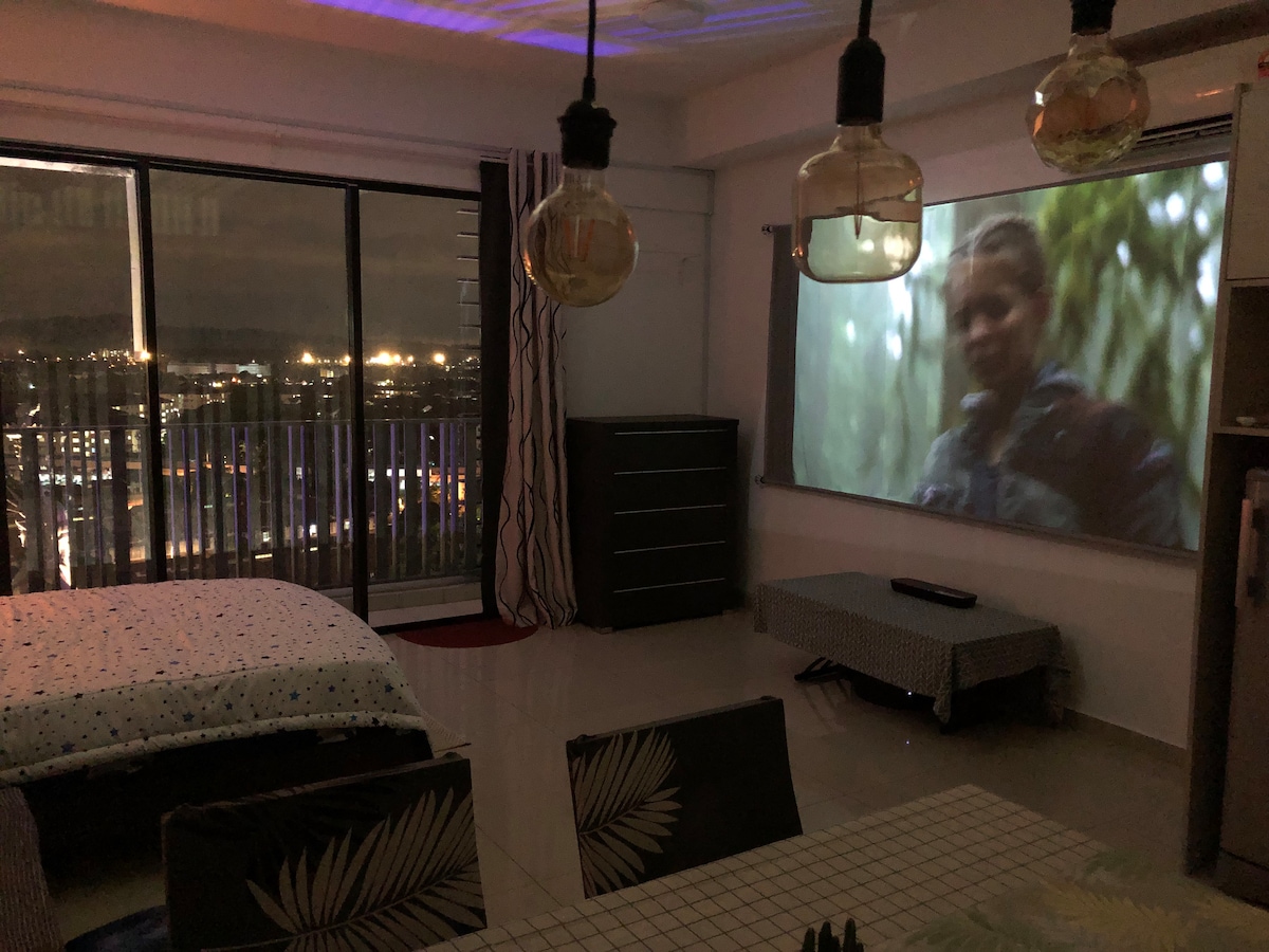 Enjoy a stylish experience at this centrally-located place. #Staycation #KotaDame Emporis SOHO Come with - 1 Queen Bed - 2 fresh Towels will be provided - Washing machine (FREE to use~!) - Hair dryer - Fridge - Kettle - Air fryer - Iron Set - WIFI (100mbps TIME Fiber) - Branded TV BOX (EV Pad) - 4K Projector Screen (Over 100 inches) Check-in is from 03:00 PM, and check-out is 11:00 AM.