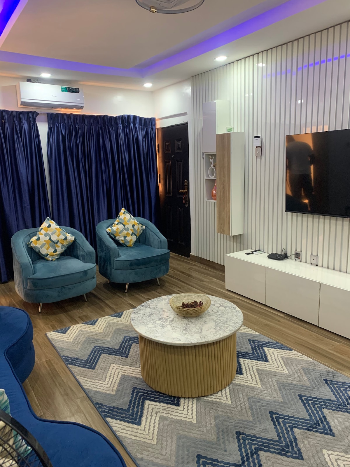 Tastefully designed 1 - bedroom luxurious apartment located in a serene and affluent neighborhood in 📍oluyole estate, ibadan. Facilities include: - Superfast WiFi - 24/7 support - 24/7 Electricity + inverter - Air conditioning - Housekeeping - Netflix - Dstv - Swimming Pool - Fully equipped kitchen - Free parking space - Top notch security For shortstay: Minimum of 2 days. *Additional services*: Chef 👩🍳 on request ‼️NO SMOKING INDOORS🚭 just at the balcony
