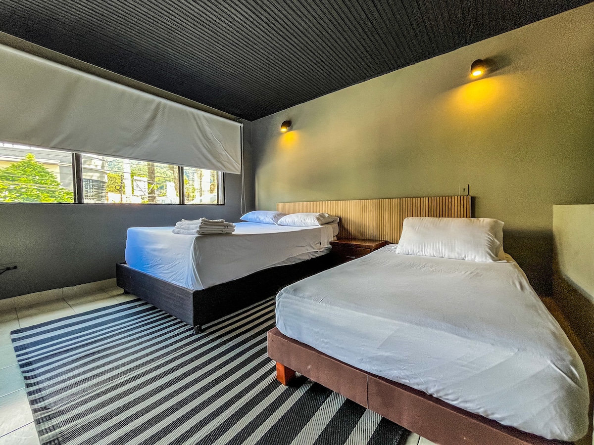 Habitación Colombiana – Amplia y Privada (Baño Privado) Una habitación luminosa de 20 m² inspirada en las raíces colombianas. Cuenta con dos camas dobles, baño privado y vista a la sala exterior. Ideal para 4 personas - familias o grupos pequeños.