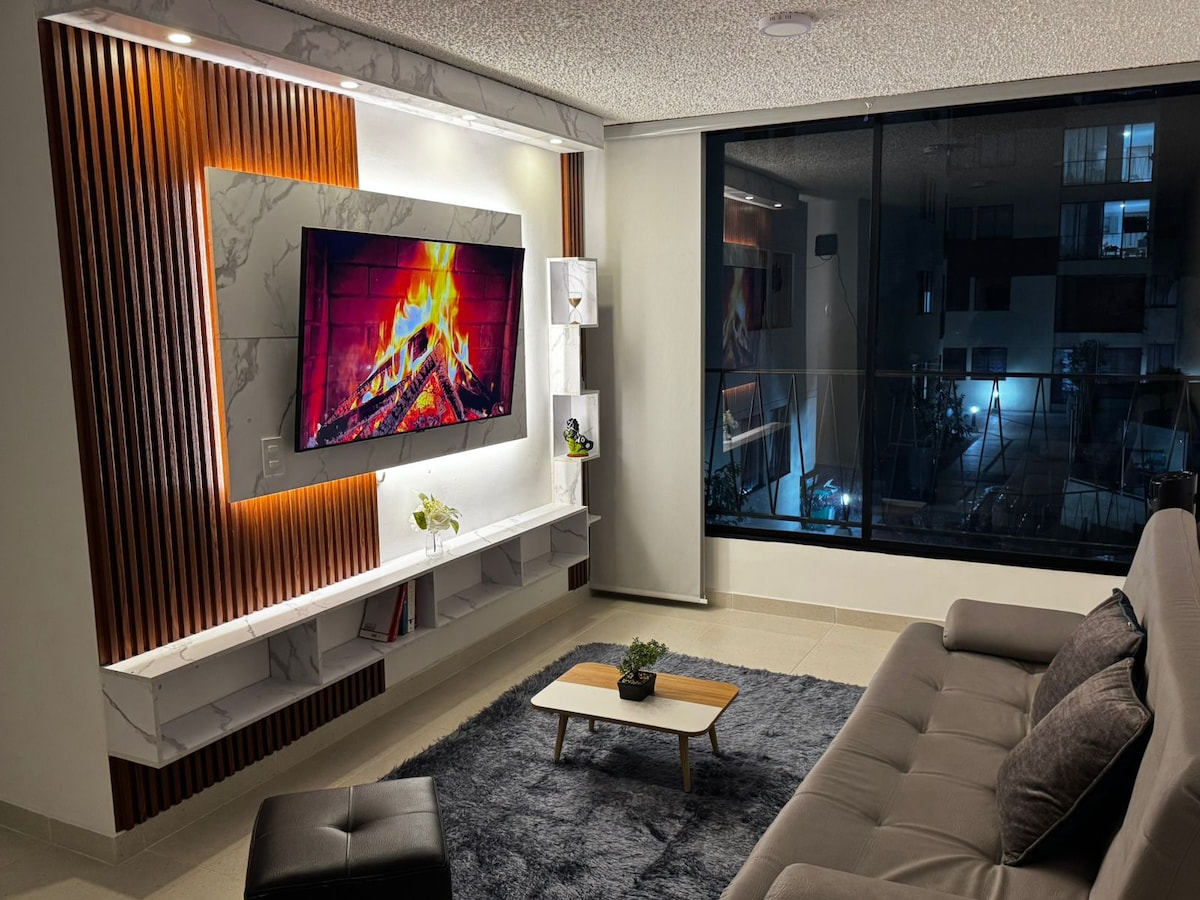 Acogedor apartamento, diseñado pensando en tu confort, ideal para disfrutar de una grata estadía en nuestra ciudad. Cuenta con excelente ubicación, cerca de almacén Éxito, Homecenter, centros comerciales, parque deportivo, restaurante Felo y Churrasco. Cuenta con dos habitaciones amplias, dos camas Queen, un sofacama, dos baños, cocina integral, balcones, estudio, patio de ropas independiente, sala comedor con Televisor. Así que se pueden alojar muy cómodamente de una a cinco personas.