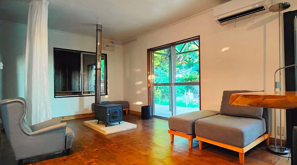 Just 5 minutes from Otake Beach, a small forest awaits. Here, you’ll find a charming triangular-roofed house and a tree deck nestled among the trees. This picturesque house and breezy tree deck will become your second home. Relax and enjoy the sunset or the dappled sunlight on the deck. A 3-4 minute drive brings you to a 7-Eleven or the fresh market at Kashimanada Seaside Park for food and drinks. Enjoy a barbecue in the garden or savor sweets on the deck.