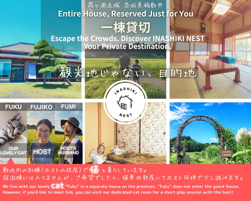 【一日一組限定・2泊以上割引あり・同敷地内の別棟にホスト常駐で安心です】 INASHIKI NEST(稲敷ネスト)は、東京から車で約90分、成田空港から約40分。霞ヶ浦近くの静かな田園地帯・茨城県稲敷市にある古民家宿です。 「となりのトトロ」のような風景が広がり、どこか懐かしい日本家屋で、五感をひらくような滞在をお楽しみいただけます。 宿の前には小さなキッチンガーデンがあり、季節の野菜やハーブを育てています。 キッチンガーデンでハーブを摘んだり、畳の上でごろり。鳥の声や風の音を聞きながら、こどもも大人も心ほどける時間を。 ◉喧騒から離れて静かな環境でゆっくり過ごしたい方や、お子様連れでのんびりしつつも楽しく田舎暮らし体験したいご家族やグループにおすすめです。 ◉観光地ではないからこその静謐な環境と余白があり、同じ敷地内の別の家にホストが住んでいるので、清掃・管理も行き届いて安心してご滞在いただけます。 ◉最寄駅はありませんので、お車・レンタカーでお越しください。 ◉シャワー室が2つありグループでも待たずにご利用いただけます。(浴槽はありません)