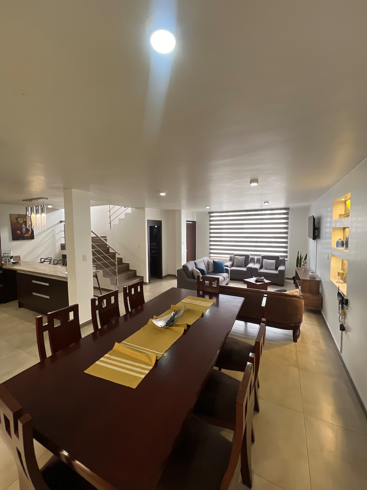 Linda casa de una sola planta con todas las comodidades que necesites, ubicada en un tranquilo y seguro conjunto residencial a diez minutos del centro de la ciudad. Con una impresionante vista panorámica de la majestuosa montaña. La casa cuenta con sala, cocina, comedor, tres dormitorios con camas matrimoniales y dos baños completos, con capacidad para 6 huéspedes. También incluye una terraza y una zona de lavandería. Conexión wifi, estacionamiento gratuito y dos televisores por cable.