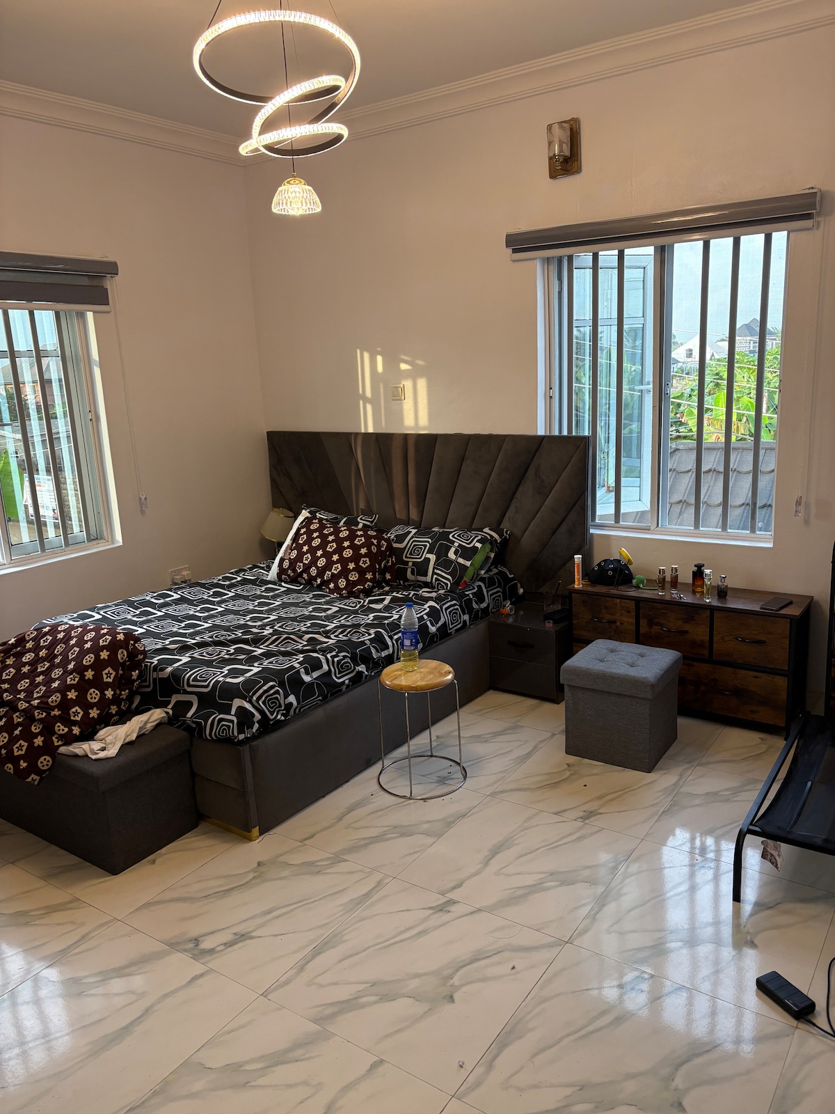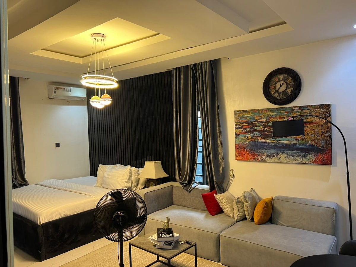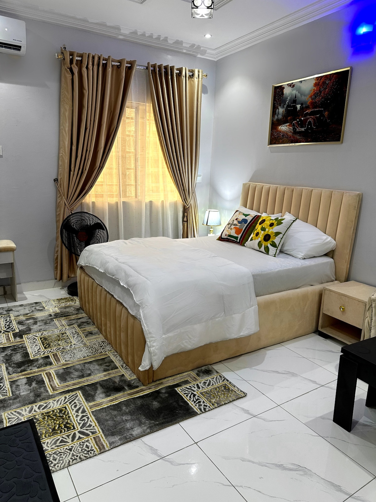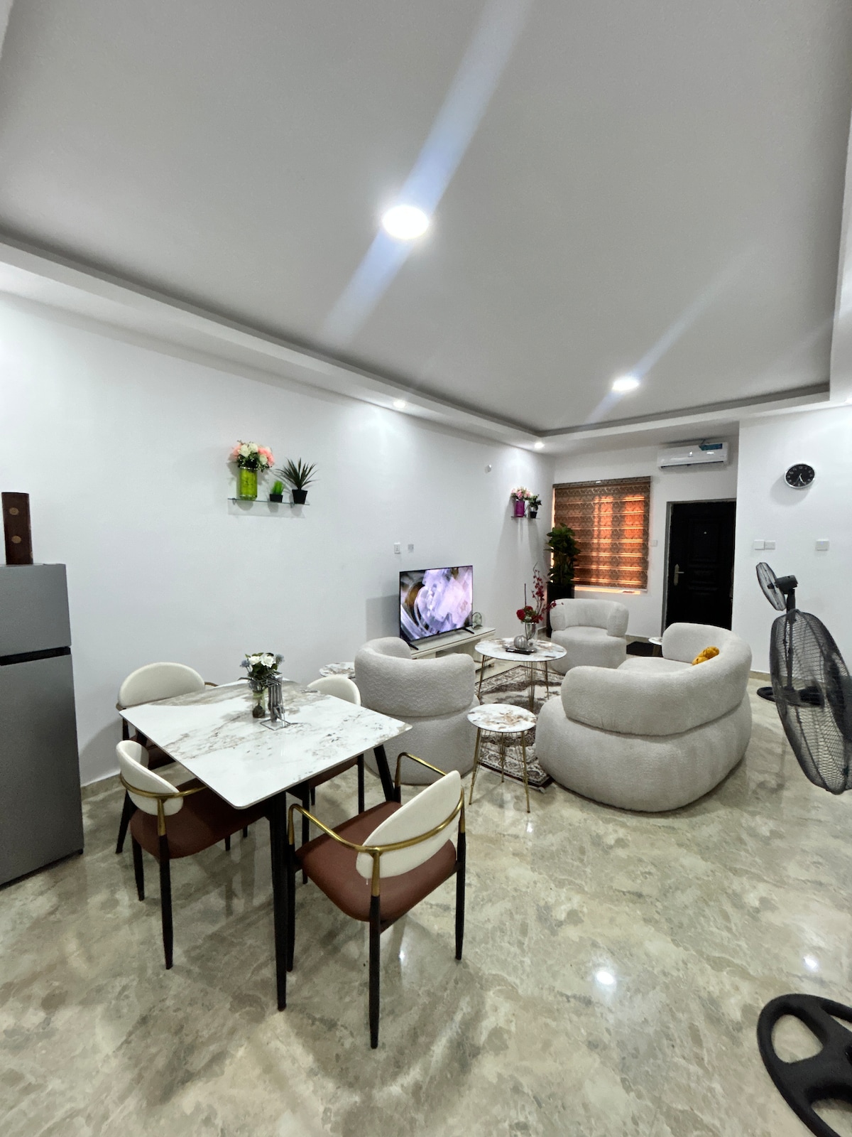 This unique place has a style all its own. It’s a 1-bedroom and sitting room serviced apartment. Amenities include ; - 24/7 power supply - Smoke extractor -Microwave - CCTV camera - DSTV/Netflix -TV console -water heater - snooker board - table tennis - washing machine - Large parking space - Reading chairs and tables - Gas cooker -Freezer