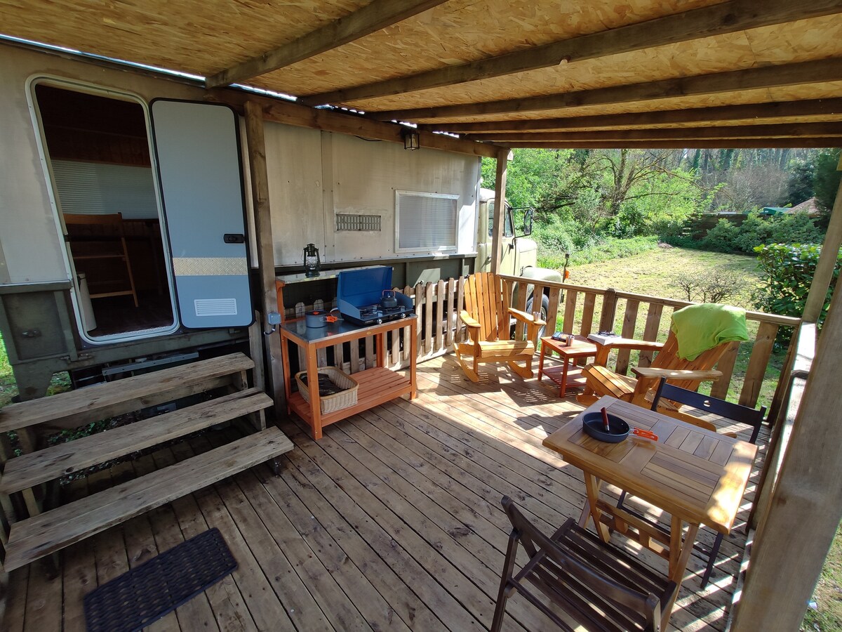 "Le TRUCK" Camion atypique pour 2 personnes, ancien modèle militaire Saurer DM2 de 1965 au cœur d'un petit camping familial calme et verdoyant. 1 espace intérieur de 18m², tout aménagé en lambris chaleureux avec 1 grand lit 140x190. Kitchenette intérieure et extérieure équipée d'un réfrigérateur, de feux gaz, micro-ondes, cafetière, bouilloire et vaisselle. Grande terrasse à vivre, couverte, avec fauteuils en bois, table à manger et chaises. Sanitaires du camping à proximité.