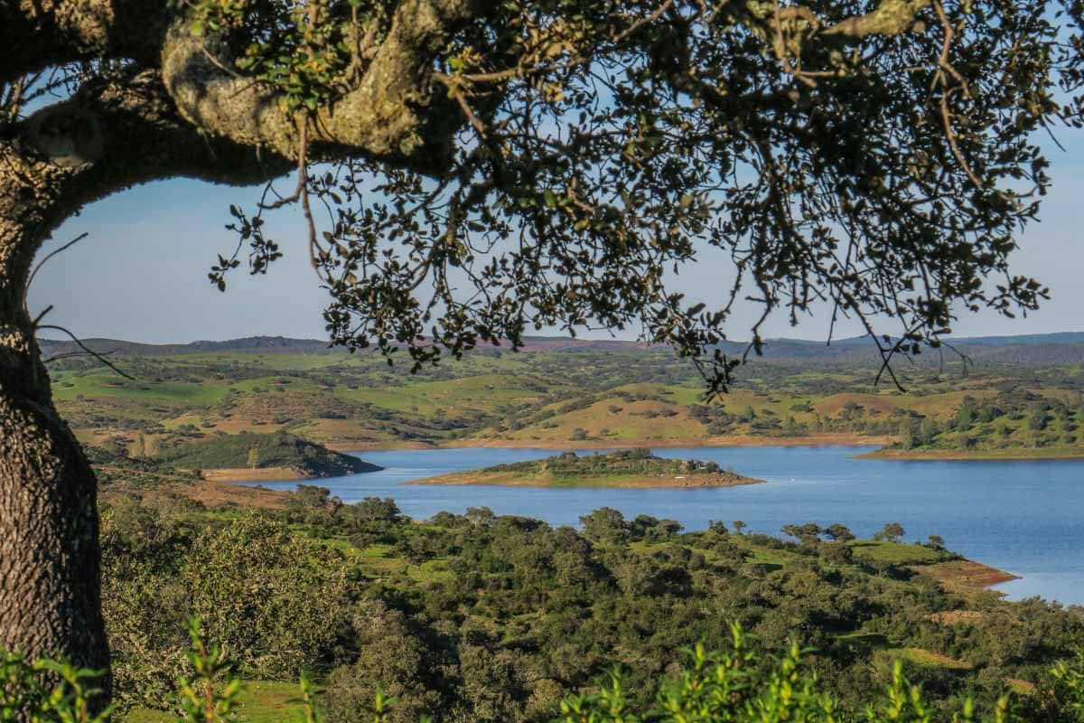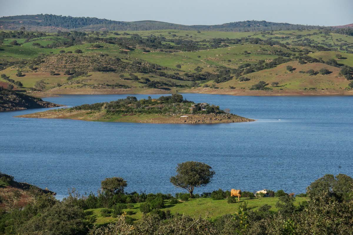 Tartaruga is a one acre islet situated in the dammed Chança River that forms in Southern Alentejo the border to Spain. The landscape is dominated by evergreen oak trees. Cistus and lavender covering the hills, enchanting with their fragrance.