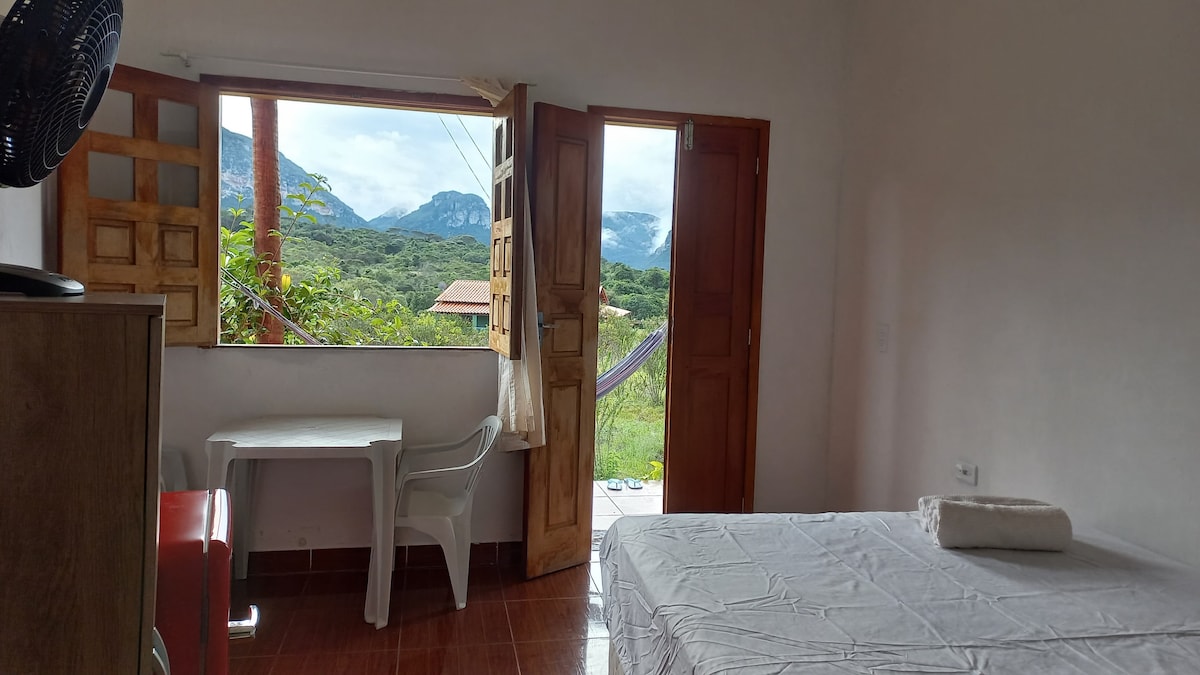 Suíte Casal: Cama casal, Tv, ar condicionado, frigobar, cromoterapia, banheiro com chuveiro elétrico