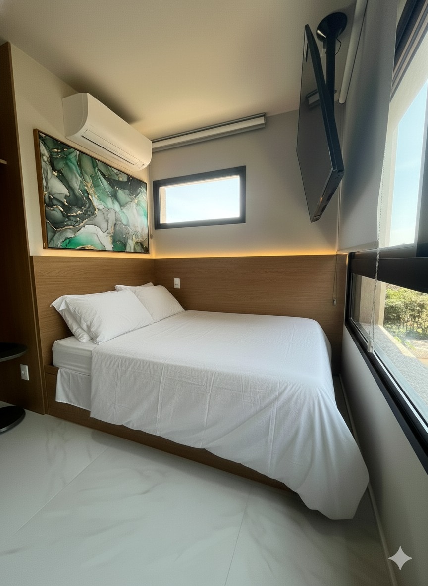Studio contemporâneo, impecavelmente decorado e cheio de detalhes sofisticados, situado na área mais desejada de Moema, a apenas 6 min a pé da estação Moema e a 900 metros do Parque Ibirapuera. Um espaço ideal para casais, viajantes solo ou a trabalho, reunindo conforto, estilo e praticidade. O Studio conta com cama de casal, enxoval premium Teka Profiline, ar-condicionado, Wi-Fi rápido, Smart TV 50'', cozinha totalmente equipada e um banheiro refinado, com toalhas macias e amenities completos.