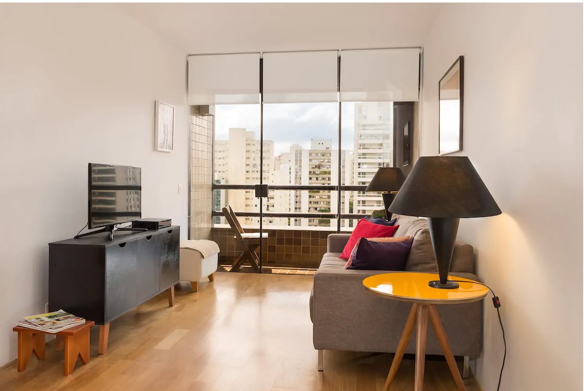 Extremely well located with maid service and cleaning every day. Excellent pool, gym and sauna on the rooftop. Valet parking. Surrounded by the most popular and award-winning restaurants and bars in São Paulo. Bright and ventilated apartment. Living room with sofa bed queen size for watching television and dining table for 4 people. Room with queen size bed and desk. Kitchen with all utensils. Parking space.