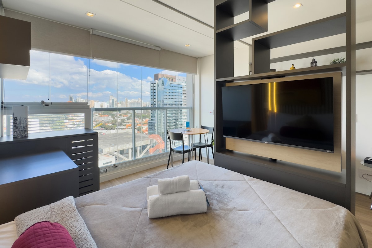 Relax in the best location of São Paulo, between Jardins and Pinheiros. This newly opened studio is a 5-minute walk to the Oscar Freire subway station, in a new building with all the infrastructure for a quiet and comfortable stay. It is on top of a bakery with artisan bread and across the street from a supermarket. The building has coworking and coliving space, laundry room, gym, rooftop pool, and a 24-hour doorkeeper. Wi-Fi 450Mbps.