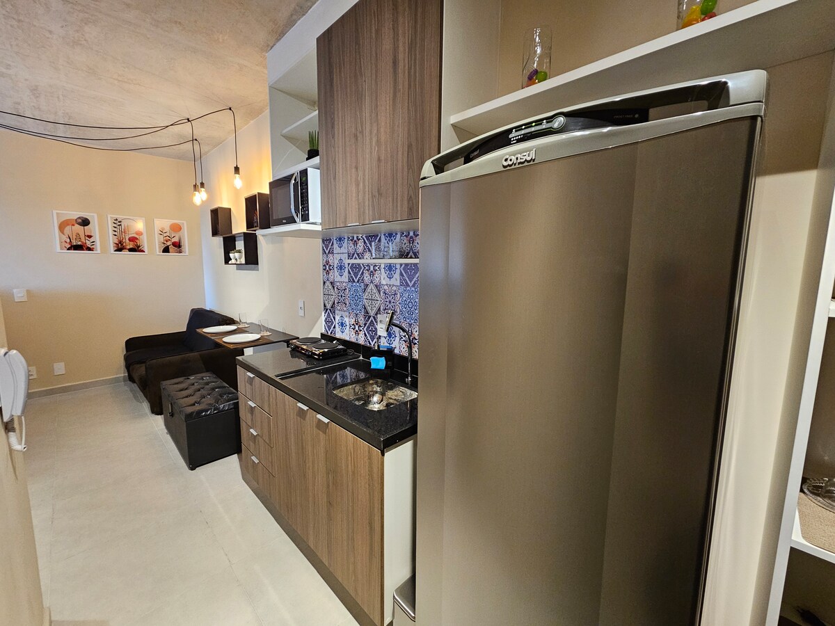 High standard, built in January/2018, decorated and equipped for your comfort and well-being. It has a modern, clean decor, and the furniture and utensils are top of the line. The studio integrates living room/suite. Bathroom with built-in closet. Central gas heating. Full kitchen and service area with built-in closets. Balcony closed with roller blinds.
