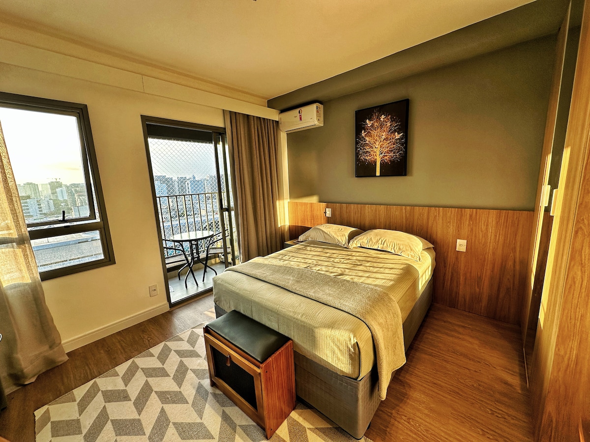 Stay in a compact and functional studio located in the heart of Moema, one of São Paulo's most prestigious neighborhoods. Here, you'll find everything you need for a comfortable stay Equipped with air conditioning, a Smart TV, and high-speed Wi-Fi Fully Equipped Kitchen: Compact and includes a cooktop, oven, microwave, refrigerator, and all the necessary utensils for preparing meals. Bed and bath linens provided, easy check-in with a digital lock, and 24-hour security at the front desk