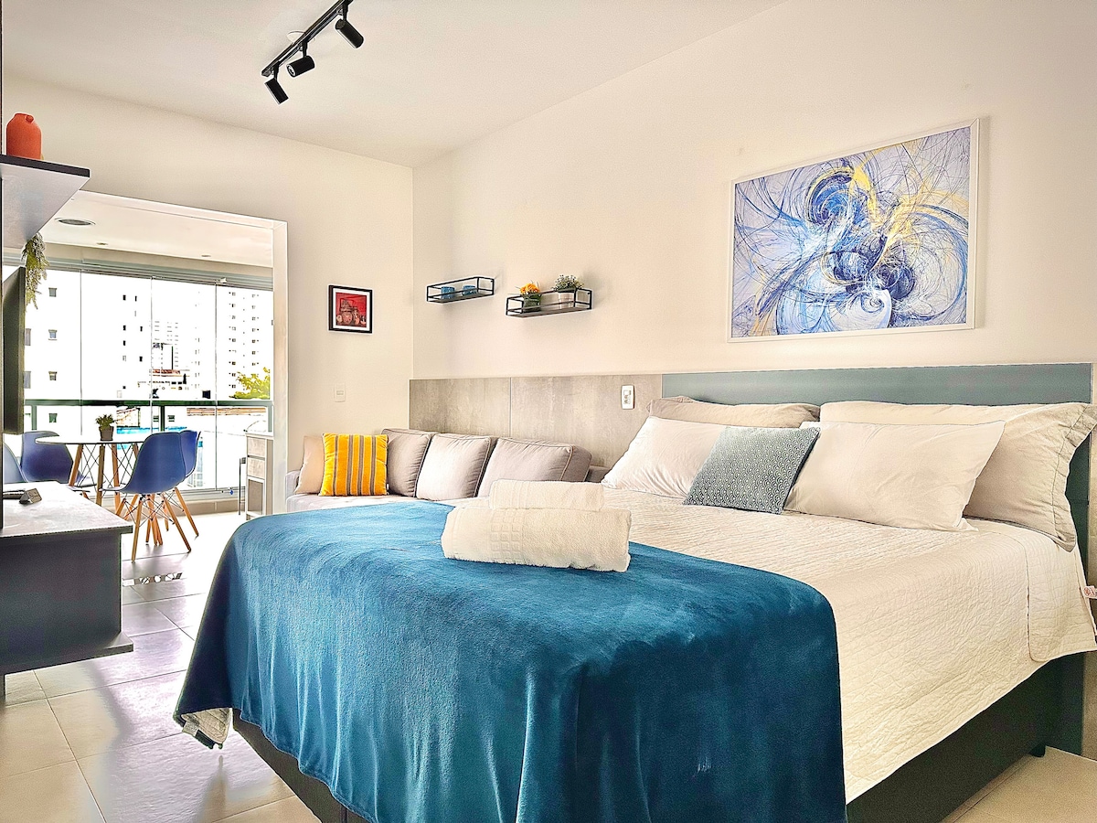 Studio moderno e completo em Moema, um dos bairros mais charmosos e bem localizados em São Paulo. A poucos minutos do Metrô, Aeroporto de Congonhas, Shopping e Parque do Ibirapuera, você estará perto de tudo que precisa, seja para lazer, trabalho ou tratamento médico. O espaço conta com Wi-Fi rápido, ar condicionado, cozinha completa, roupa de cama e banho. No prédio tem piscina aquecida, jacuzzi, academia, lavanderia e mini mercado. Observação: Há ruído de avião na região até um certo horário