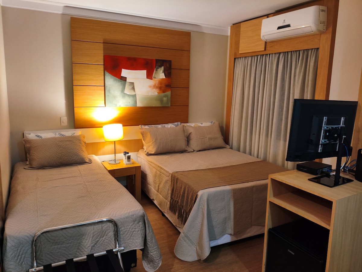 Our pension is located in one of the best neighborhoods in São Paulo - Vila Olímpia. It's a great area, surrounded by parks, restaurants, markets, pharmacies, tech companies and institutes. This specific bedroom provides one double bed and one single bed, and shares a bathroom with another bedroom on the same floor. We do have a cleaning lady available during business hours that will help you with anything you need, additionally me and my son are always around - Book now and come meet us :)