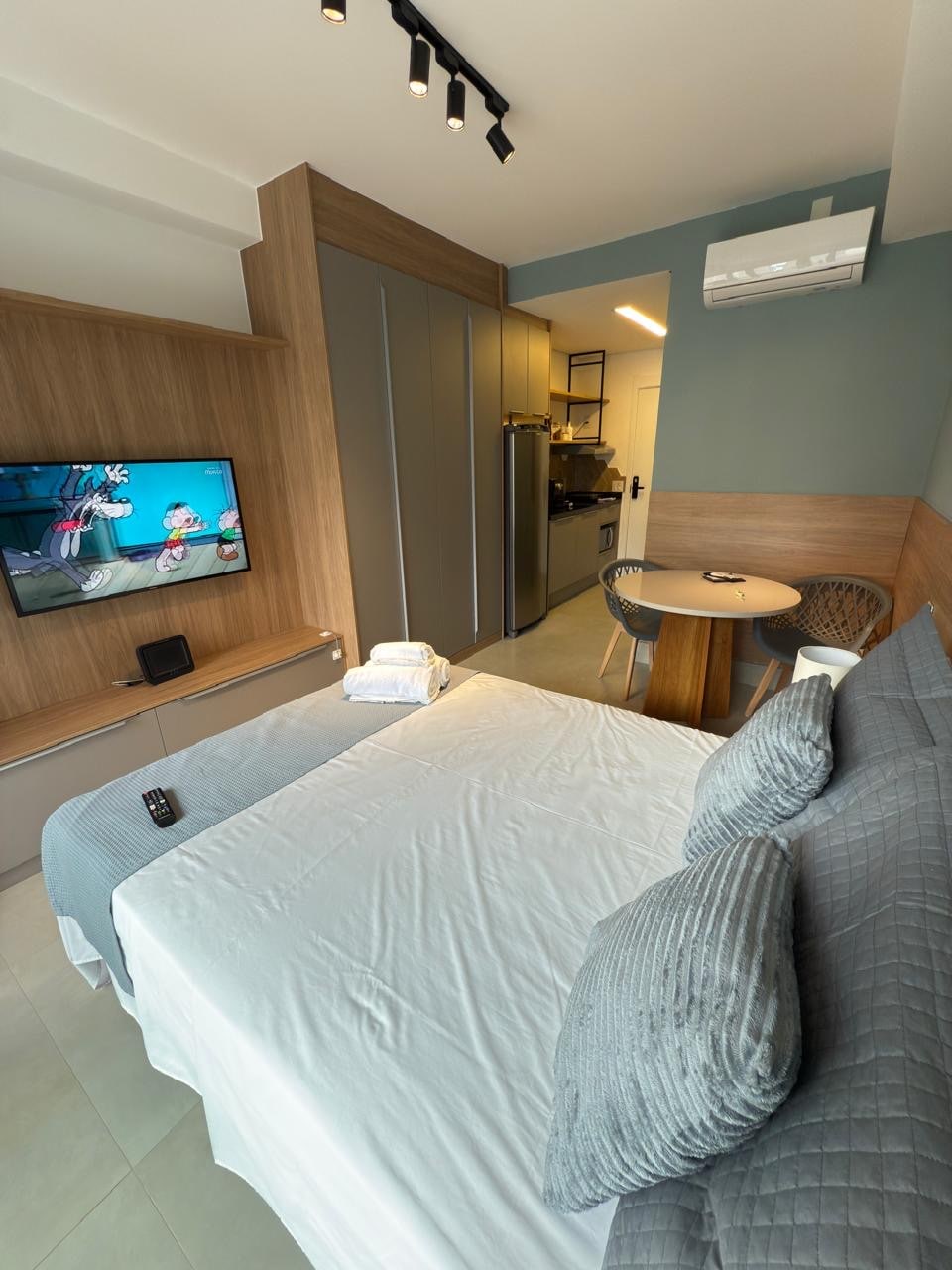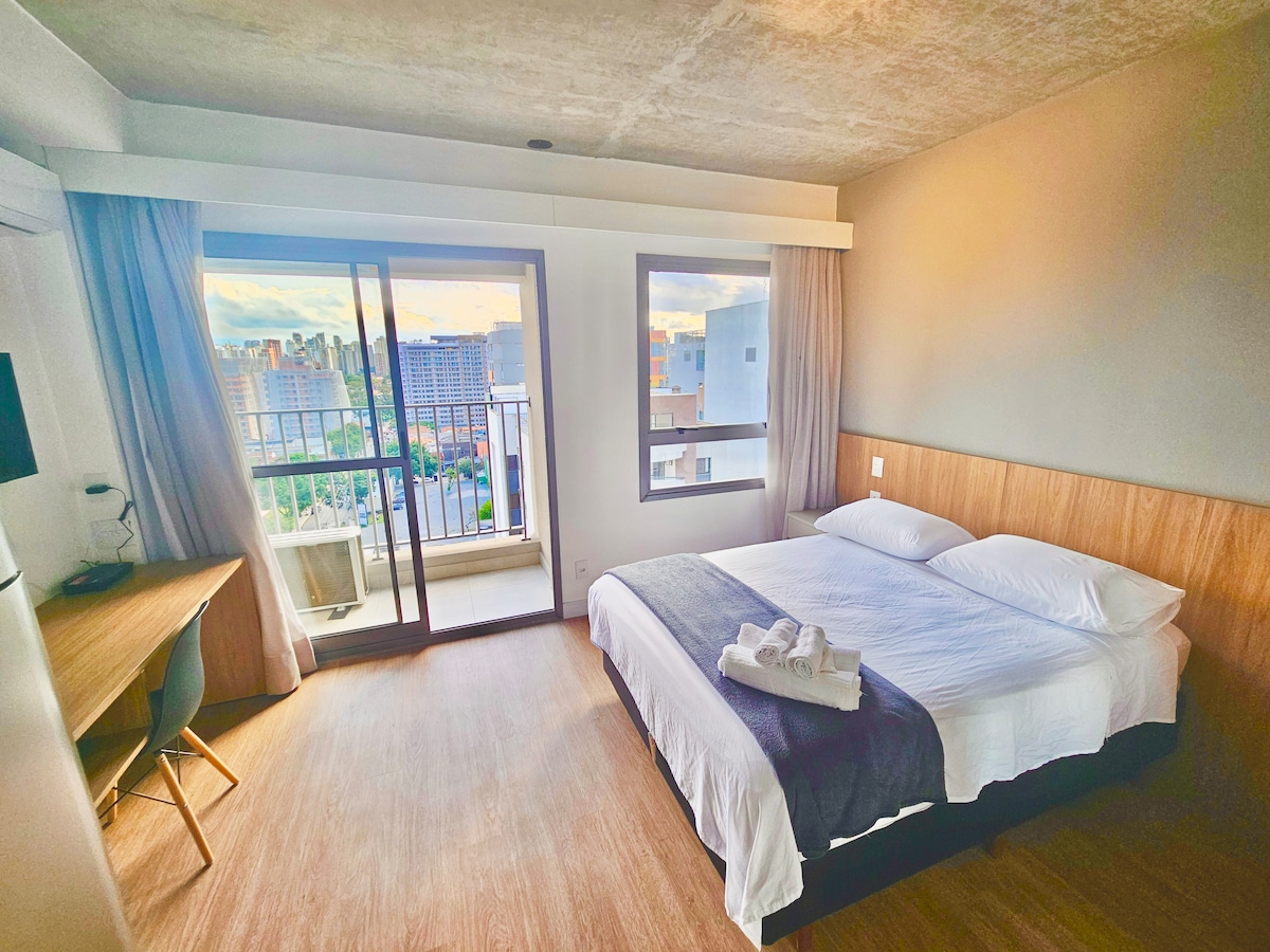 Stay in a compact and functional studio located in the heart of Moema, one of São Paulo's most prestigious neighborhoods. Here, you'll find everything you need for a comfortable stay Equipped with air conditioning, a Smart TV, and high-speed Wi-Fi Fully Equipped Kitchen: Compact and includes a cooktop, oven, microwave, refrigerator, and all the necessary utensils for preparing meals. Bed and bath linens provided, easy check-in with a digital lock, and 24-hour security at the front desk