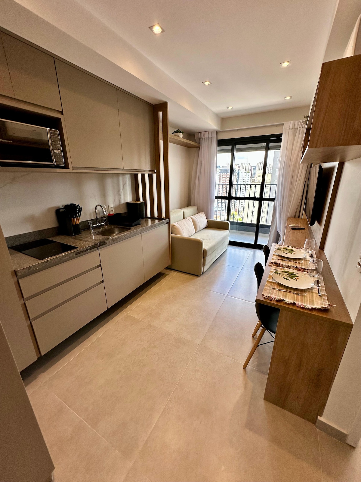 Studio novo em Moema , decorado em grande estilo , luz indireta , mesa de refeição, bancada de trabalho cozinha completa com cooktop , geladeira , microondas e cafeteira , internet e TV smart , varanda anexada , cortina blackout , 11° andar . Armários finos . Prédio com lazer completo, espaço de coworking , piscina , salão de festas , lavanderia , mercado autônomo . Na quadra do metrô Moema . Estacionamento em frente conveniado . Prédio novo . Fornecemos todos os itens de enxoval e cozinha.