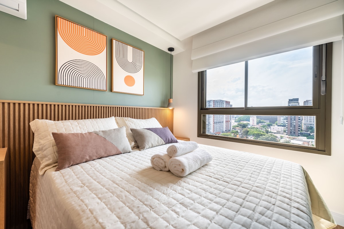 Experience One Eleven in Vila Olimpia. This modern apartment features large windows with breathtaking city views and natural light. The unit boasts 600 Mbps internet and a 4K HD TV. For total comfort, it has a Hot/Cold AC system: 27,000 BTU/h unit in the living room and 10,000 BTU/h in the bedroom. The bedroom is quiet and dark for a restful sleep. Impeccably maintained, you’ll be walking distance to top restaurants and business hubs—a safe, upscale retreat with a stunning urban backdrop.