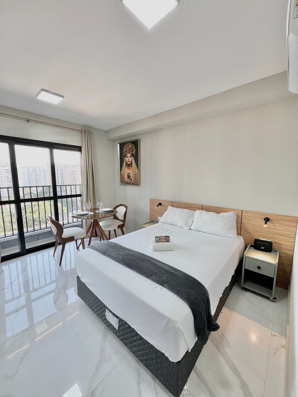 Stay in a compact and functional studio located in the heart of Moema, one of São Paulo's most prestigious neighborhoods. Here, you'll find everything you need for a comfortable stay Equipped with air conditioning, a Smart TV, and high-speed Wi-Fi Fully Equipped Kitchen: Compact and includes a cooktop, oven, microwave, refrigerator, and all the necessary utensils for preparing meals. Bed and bath linens provided, easy check-in with a digital lock, and 24-hour security at the front desk