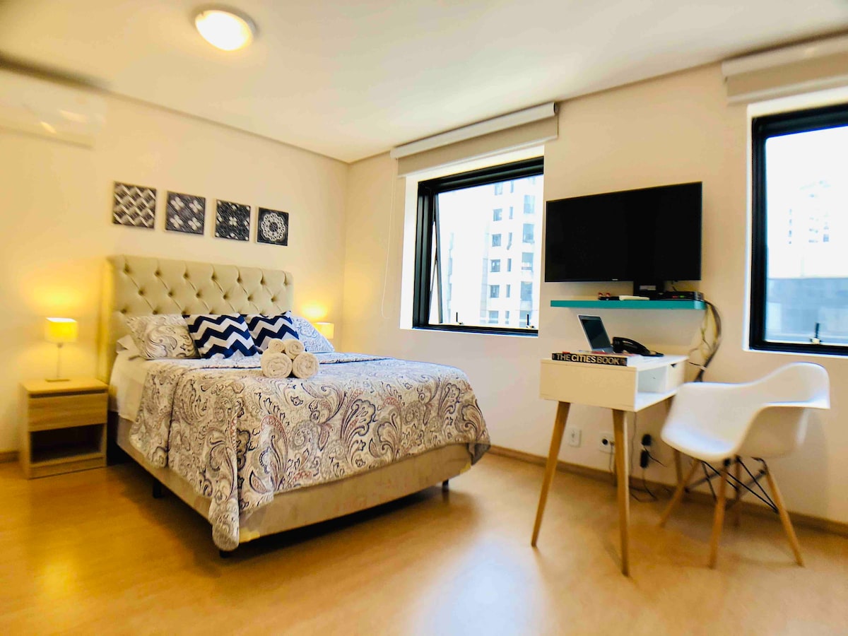 Studio of 26m², furnished with Fridge, Electric Stove, Coffee Maker, Microwave, crockery, cutlery, Smart TV, 100 mbps Vivo Fiber Internet, workbench, double bed with complete trousseau for 02 guests, daily cleaning and parking space with valet parking. The Flat is located a few meters from the Moema subway and Shopping Ibirapuera, has a swimming pool and gym on the roof, as well as a barbecue area. *Extra bed linen and bath with value to be agreed with the host.