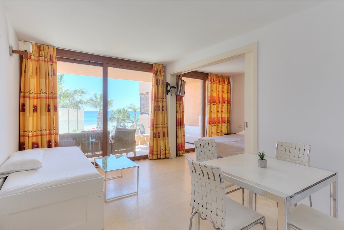 Apartment in a prime location in Playa d’en Bossa – first line to the sea with a stunning ocean view. Located just a 2-minute walk from the famous Ushuaïa and Hï clubs, this apartment is perfect for those who want to be in the heart of the action while still having a peaceful seaside retreat. The beach, restaurants, bars, and shops are all within easy reach. The apartment is modernly furnished and fully equipped for a comfortable stay,.