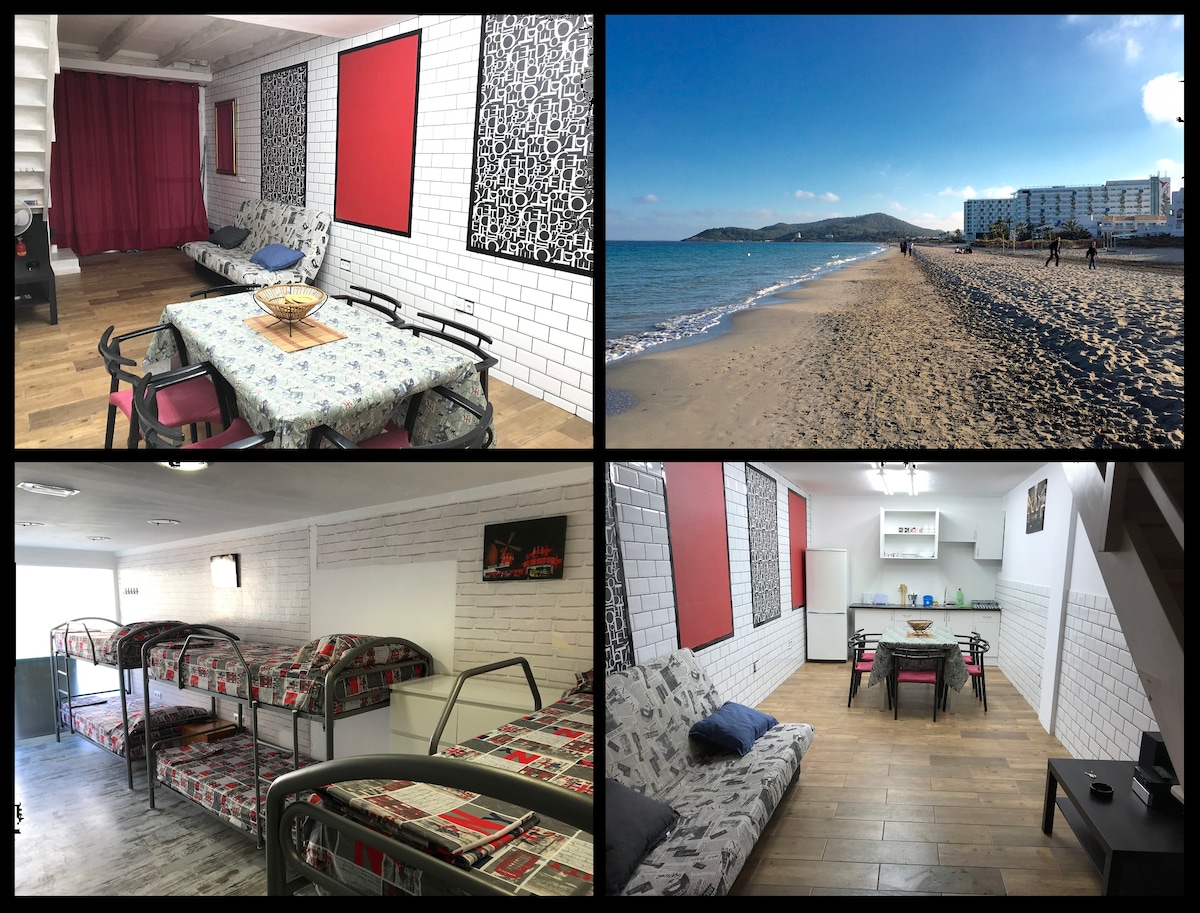 We rent an apartment in IBIZA for 6/8 people, 2 bedrooms with 2 bunk beds and 1 single bed, 1 double sofa bed in the living room, kitchen complete with all appliances (microwave, toaster, coffee maker, kettle, washing machine, refrigerator , etc ...), 2 bathrooms, balcony with sea view, air conditioning, LED TV, internet WI-FI 50MB fiber, the capacity is 8 guests maximum. Located in Playa d'en Bossa area facing the sea, a few meters from Ushuaia.