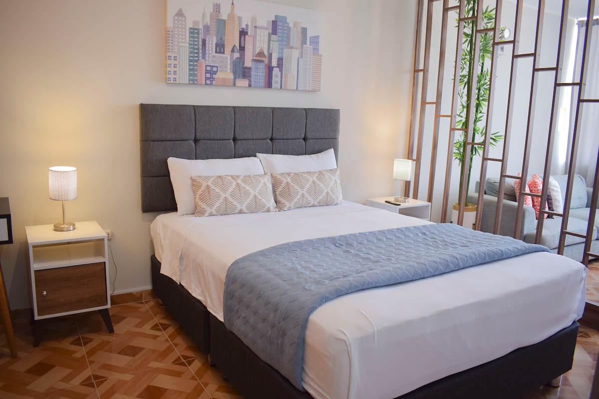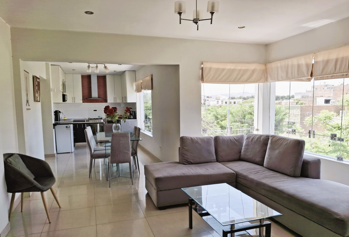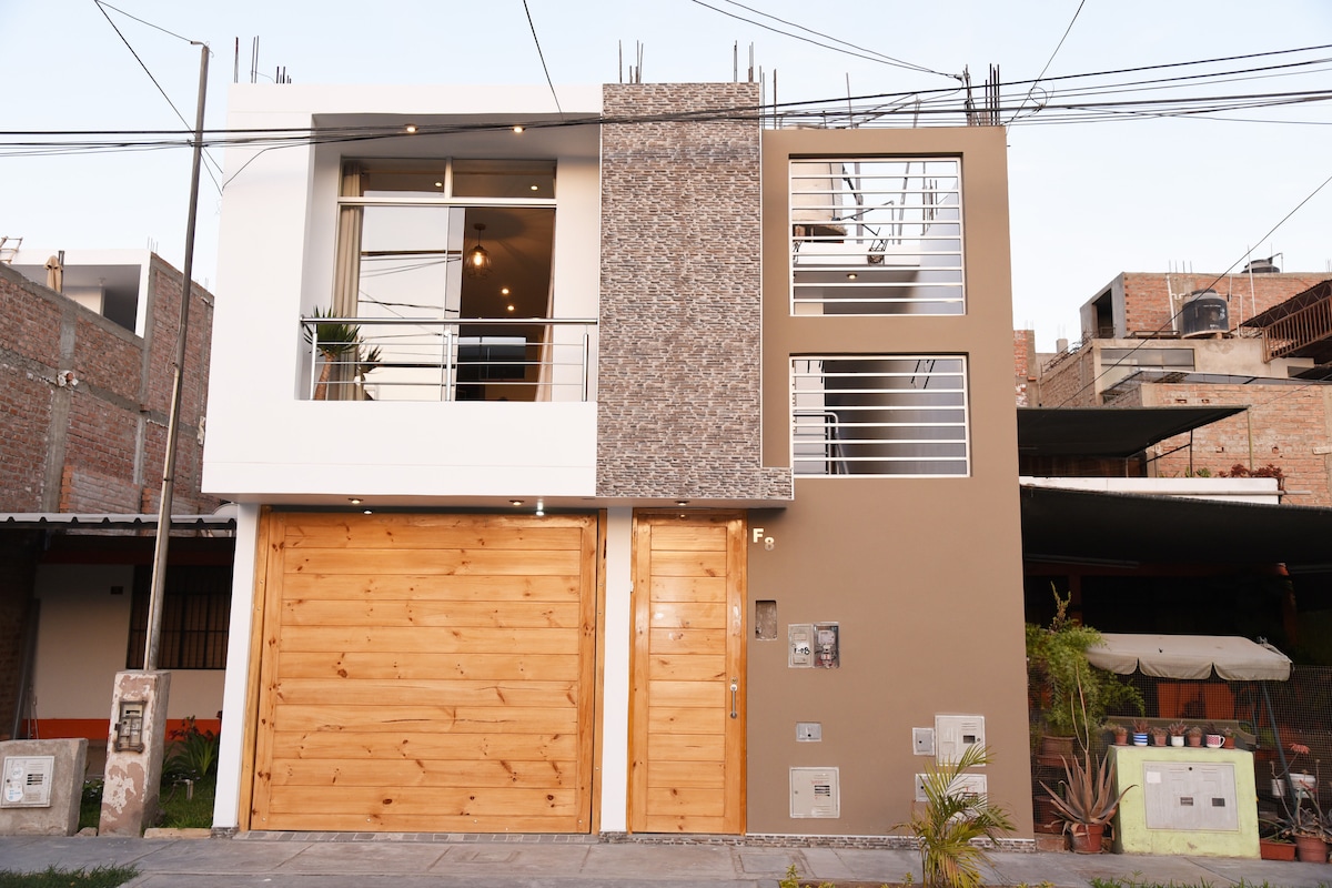 Spacious and modern apartment, fully equipped. In the excellent "Urbanización Luren" area: central and safe. Close to restaurants, banks, supermarkets, shopping centers, gyms, parks (ideal for walking or running); just a short walk away you'll be very close to everything you need for a great stay. Transportation is available at all times. - Entire apartment/1 bedroom/1 bathroom/2 people - Street parking (outside the building). - Huacachina is a 7-minute drive away.