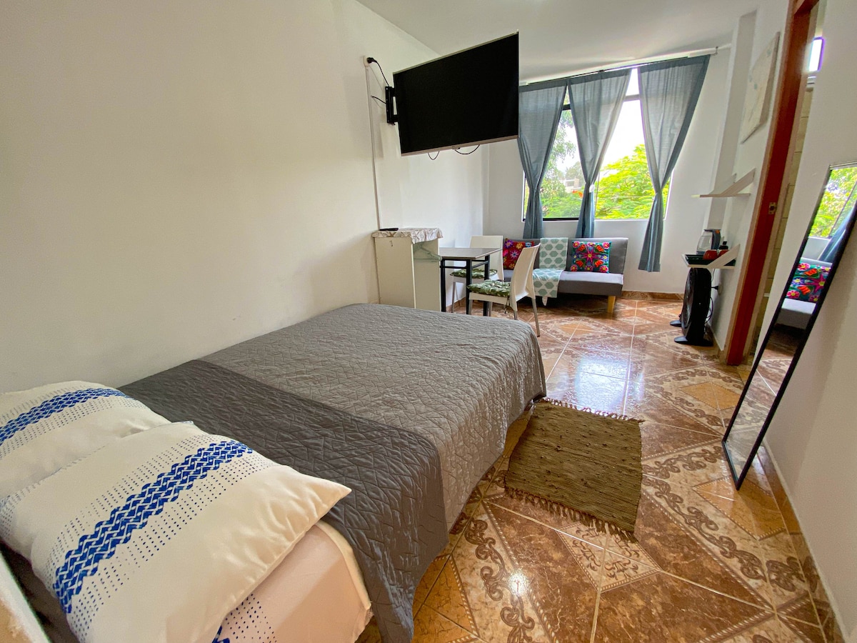 Departamento con entrada independiente y con todas las comodidades para tu familia o pareja . Tenemos muchas plantas para los amantes de la naturaleza. Ubicado en el Tercer Piso - Toda la terraza es privada para el huésped ! A 5 minutos de centros comerciales, plaza de armas, Huacachina y muchos centros turísticos de Ica.