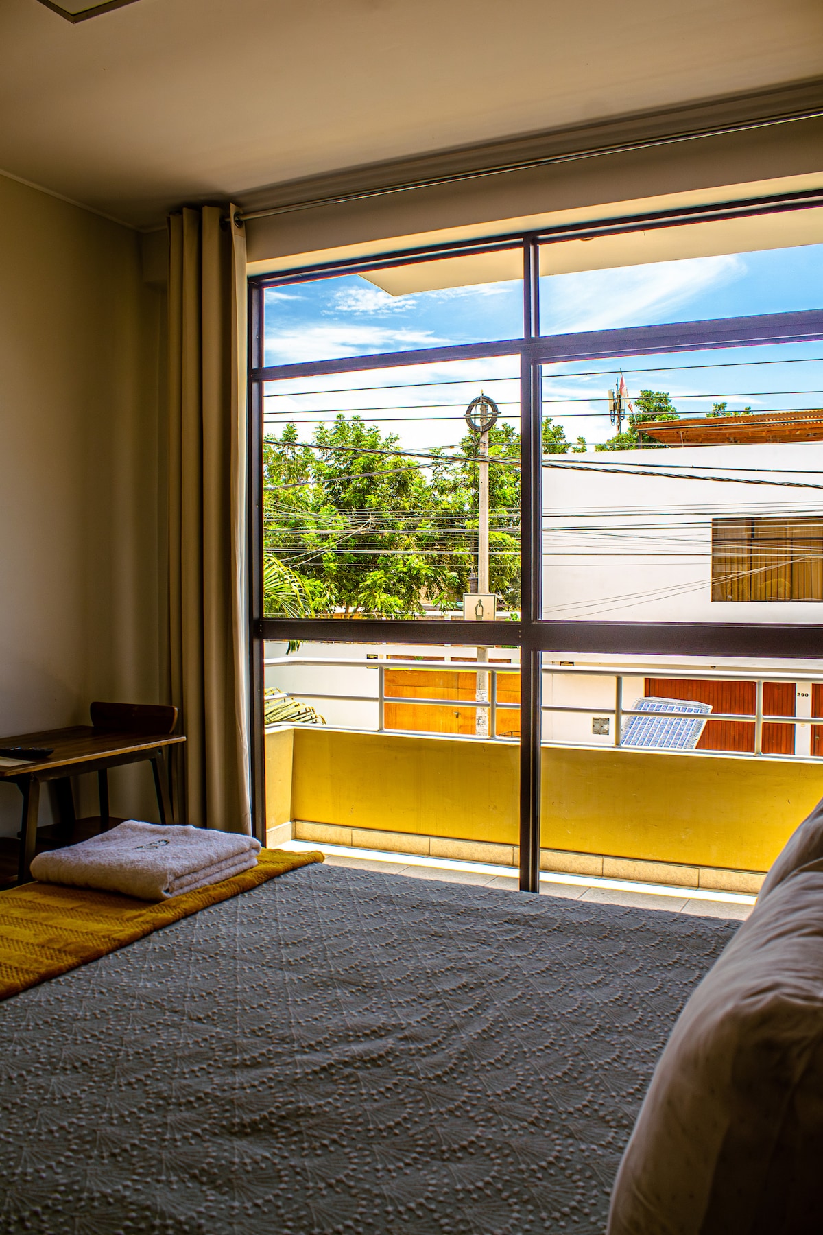 La habitación cuenta con una cama Queen de 2.5plz. Tiene los servicios como: Wifi, Cable, Baño privado, Televisor Smart. Tiene una piscina compartida, comedor amplio al aire libre, un bar donde se le brindarán diferentes cocteles, está ubicado en una una urbanización cerrada, tranquila y segura. El hospedaje se encuentra a 15 minutos de Huacachina y a 30 minutos de Paracas. Finalmente contamos con el desayuno americano para las 2 personas hospedadas con horario de 7:00am a 9:00am.