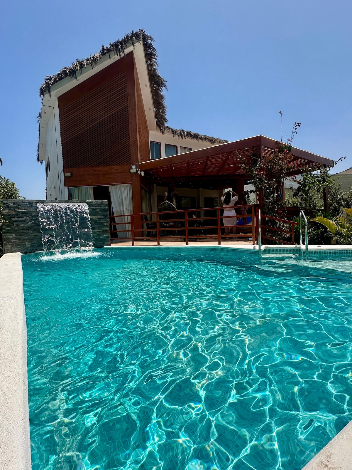 Modern and bright, luxury house, with beachfront pool, just steps away from the ocean. Housekeeper and private Chef included! Located in one of the most beautiful natural reserves in South America (Paracas) - a beach oasis in the middle of the desert, surrounded by a national parks and centuries of pre-Inca history, and 1 hour away from the Nazca lines! 3 spacious bedrooms with en-suite bathroom and closet, TV room, modern kitchen, laundry room, and a bedroom for service staff, a true gem!