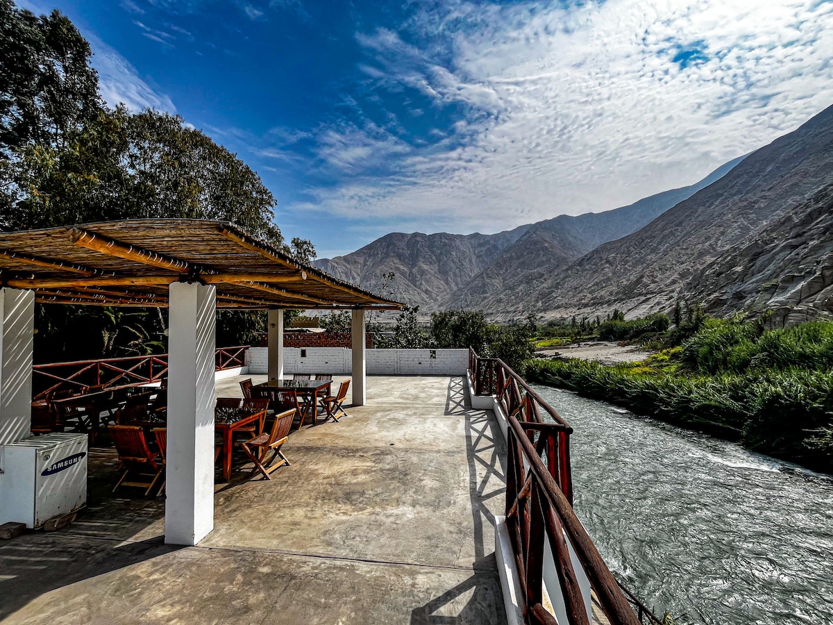 A 3 horas de Lima, en el corazón del valle de Lunahuaná, donde todo el año cuenta con un clima caluroso y saludable, le ofrecemos bungalow de piedra que ofrecen privacidad y asequibilidad. Este bungalow con toques de piedra y bambú tiene un dormitorio que viene con una cama tamaño de dos plazas y un camarote. Asimismo, un baño completo, una pequeña cocina con mesa comedor para aprovechar de los productos locales. Sus 60 m² les permitirá hospedar hasta 4 personas.
