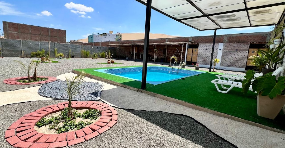 Agradable alojamiento al lado las dunas que rodean el oasis de Huacachina en Ica, con tan solo doscomodas habitaciones con gran vista panoramica de las funas que rodean el oasis de Huacachina en un agradable entorno: 1 matrimonial para 2 personas y 1 familiar para 4 personas,cocina, comedor, piscina, zona de parrilla, jardines, terraza y estacionamiento privado