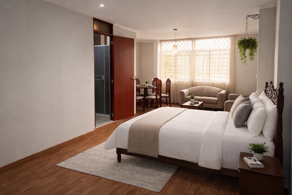 Cozy room with an independent entrance in Nazca, perfect for couples, small groups, and small families. Located on the first floor, this modern space features a double bed, a single bed, a full bathroom with hot water, a small living area, bar fridge, a standing fan, and Wifi. It includes cable TV, access to shared kitchen & laundry facilities; spacious parking. Situated in a safe area, just a 15-minute walk from the main square. An ideal choice for a comfortable and relaxing stay in the city.