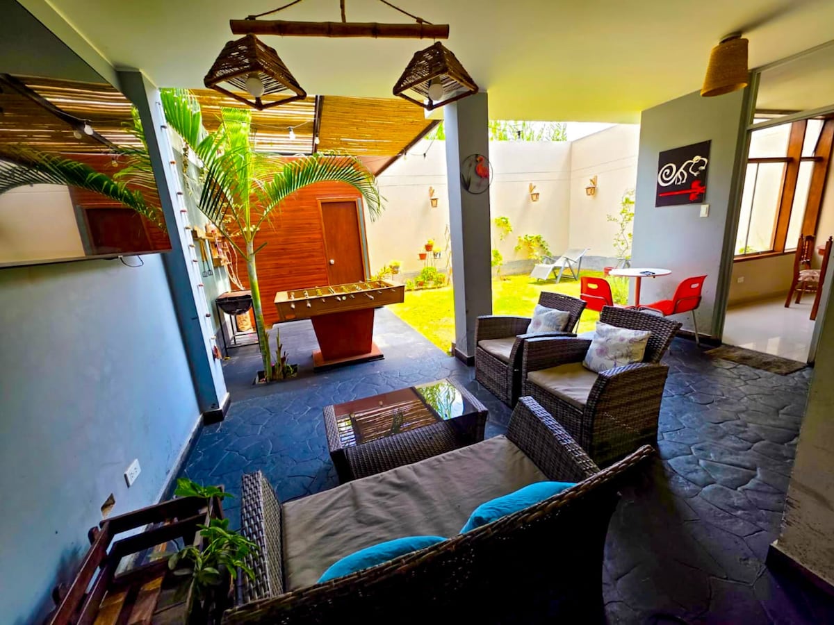 Ven a una casa que lo tiene todo! "El Descanso", Moderna y lujosa casa de campo ubicada en condominio privado en El Carmen-Chincha Disfruta del buen clima en este alojamiento con capacidad máxima de hasta 14 personas incluido niños. Una casa exclusiva para tí y los que más quieres. Más de 2000 mts de terreno con amplio jardín y una gran piscina con dos niveles para grandes y chicos.